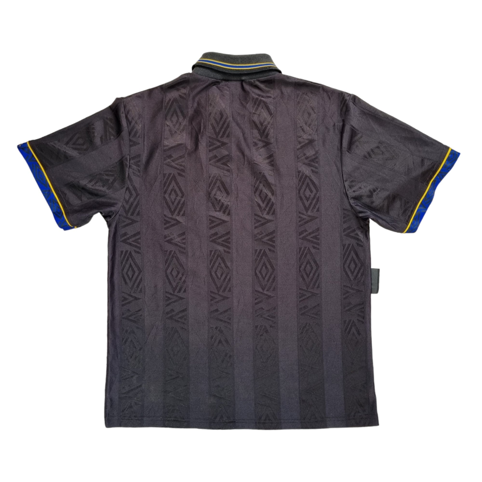 Information: Official Umbro Manchester United Away Football Shirt from 1993-1995. Popular black and gold away shirt, synonymous with Eric Cantona's Kung Fu Kick antics at Selhurst Park against Crystal Palace. A Football Finery favourite.