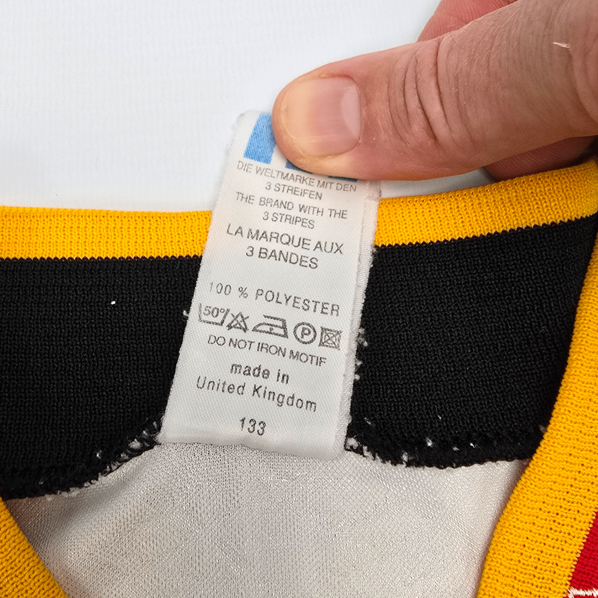 Information: Official Adidas Germany home football shirt from 1994/96, as worn by ‘Die Mannschaft’ during the 1994 FIFA World Cup in the United States and throughout the Euro 1996 qualification campaign, which they went on to win with victory over the Czech Republic. Asian market issue, so contains internal wash labels for the region. A fantastic vintage jersey, ideal for a collection of your own or the perfect gift for any football fan.