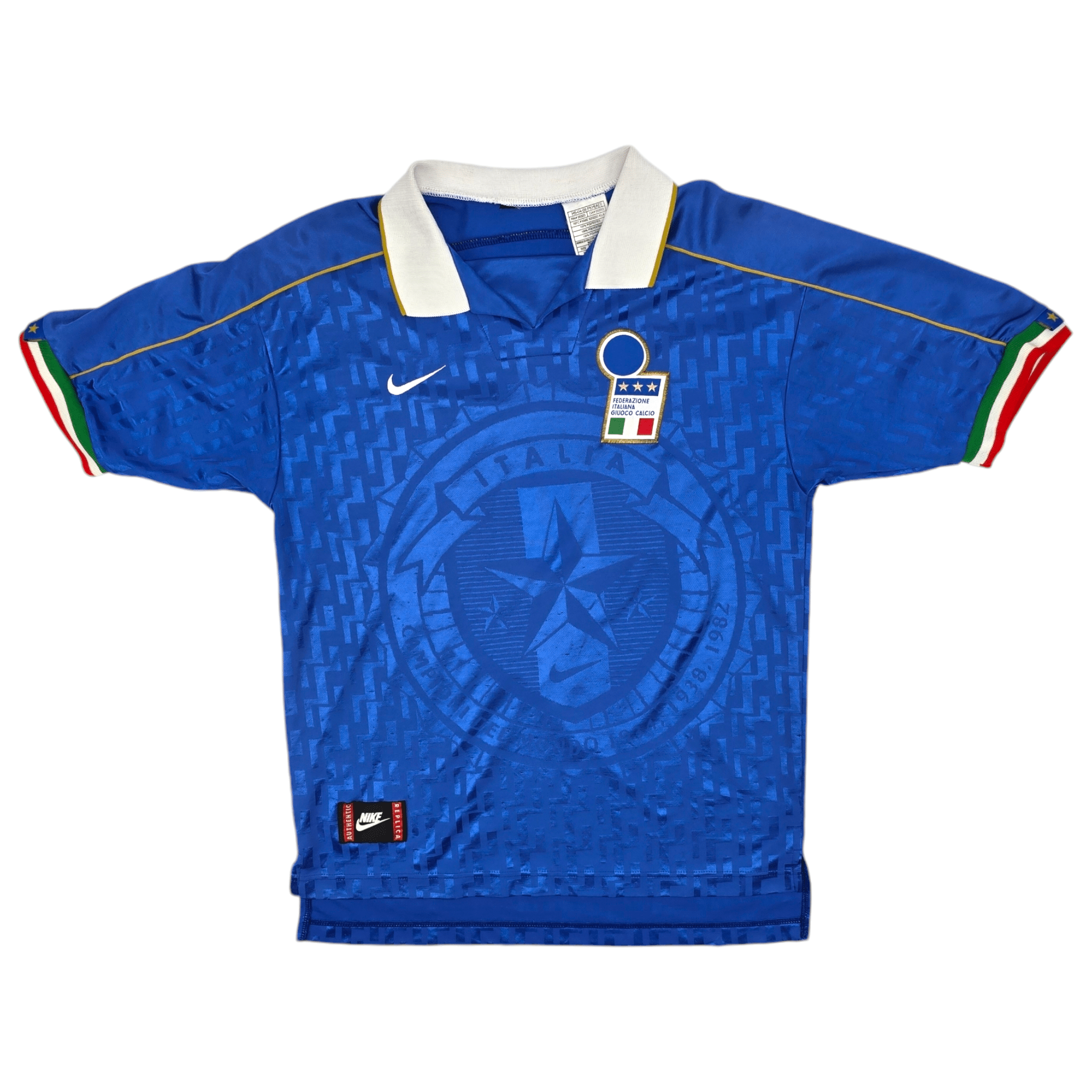 Information: Official Nike Italy home football shirt from 1995/96, as worn by 'Gli Azzurri' in the successful qualification campaign for UEFA Euro 1996 where the Italians finished 2nd in their group behind Croatia. Stunning 90s design. A fantastic vintage jersey, ideal for a collection of your own or the perfect gift for any football fan.