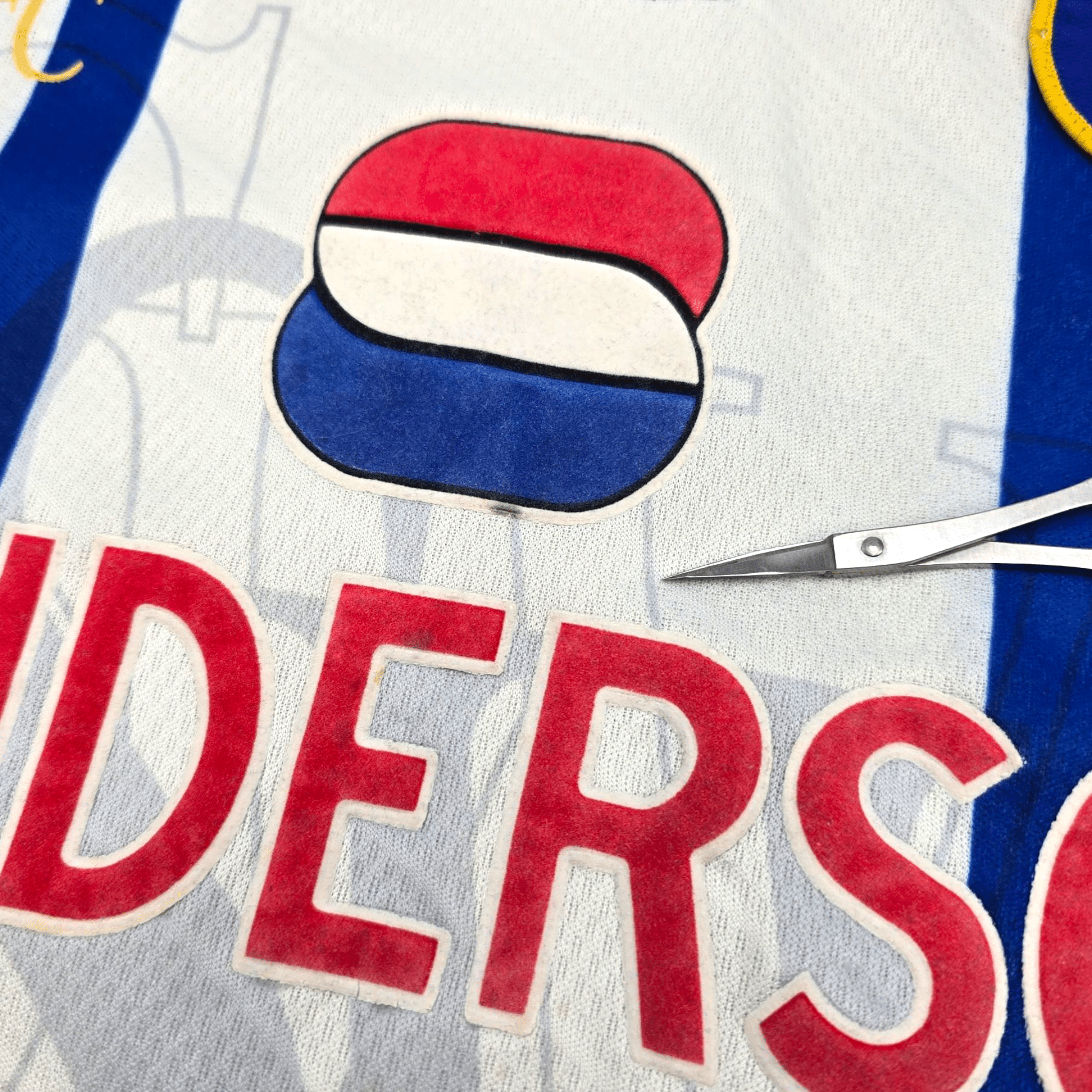 Condition: Very Good. Superb colours, material is smooth with a few bobbles & tiny pulls, a little staining below the chest sponsor (see photo), no tears or holes. Embroidered manufacturer logo & stitched team badge are excellent. Light wear and a little marking to flock chest sponsor (see photo). Collar, sleeves and hem are in fabulous condition.
