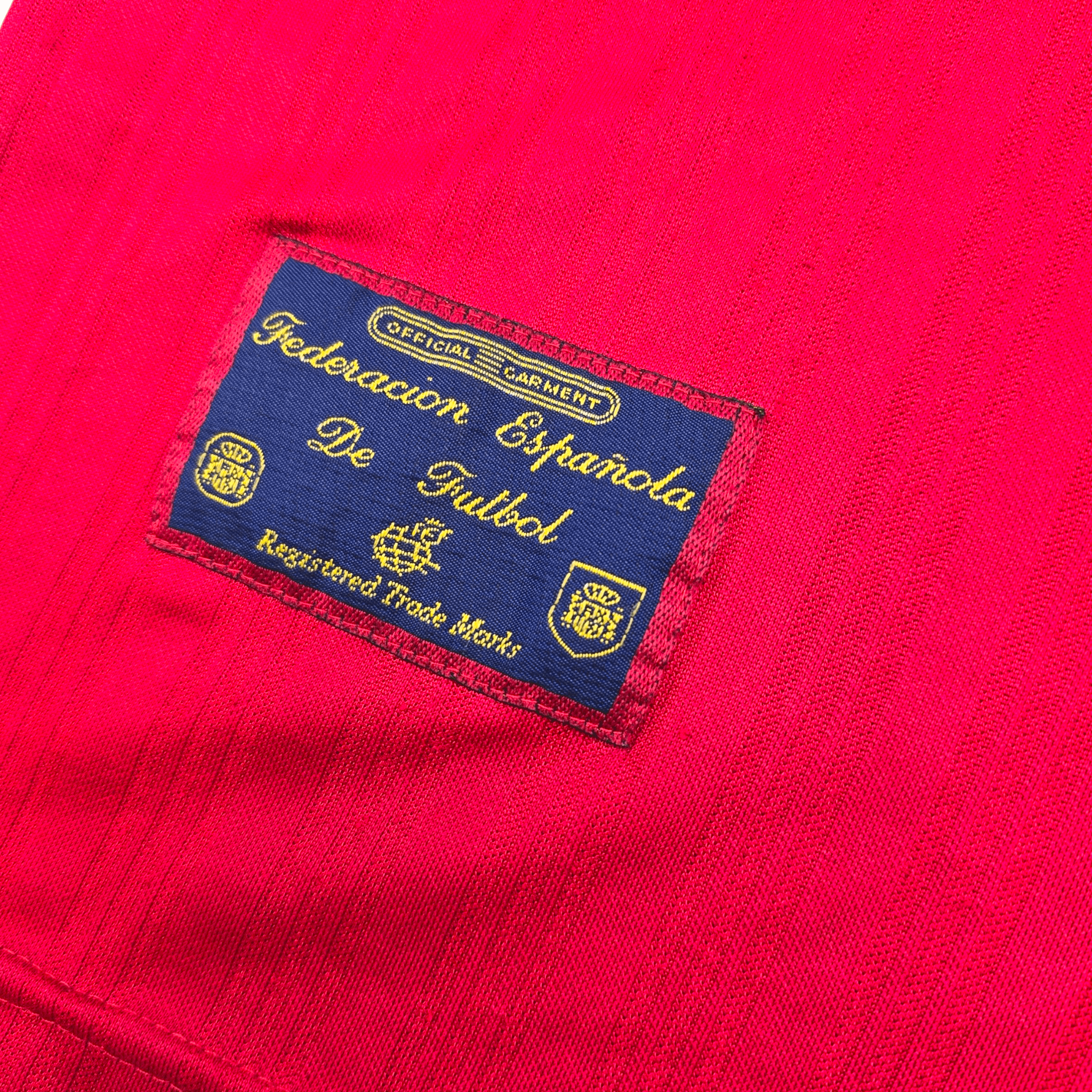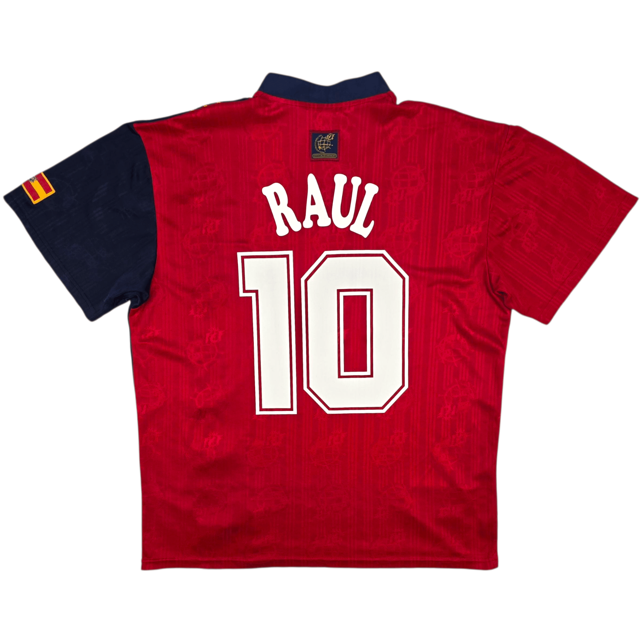 Information: Official Adidas Spain home football shirt, as worn by 'La Roja' between 1996-1998, including their UEFA Euro 1996 campaign in England. The reverse of the shirt boasts the nameset of legend, Raúl González. A fantastic vintage jersey, ideal for a collection of your own or the perfect gift for any football fan.