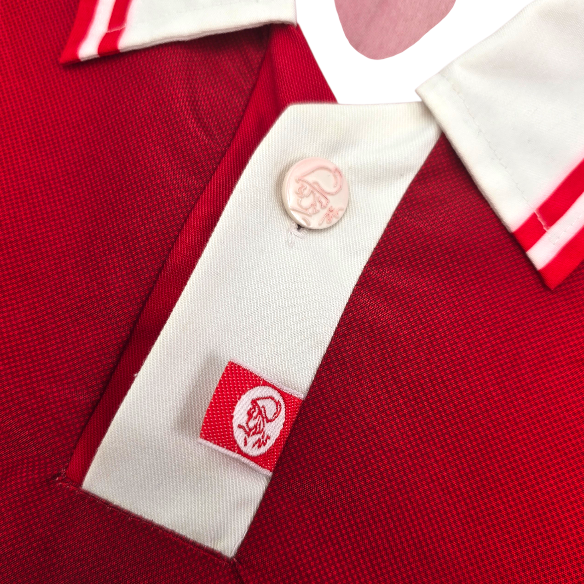 Information: Official Umbro Ajax home football shirt, as worn by ‘De Godenzonen’ during the 1997/98 season, when the side won the Eredivisie and KNVB Cup double in Morten Olsen’s first season in charge, a celebrated campaign in the club’s history. The reverse of the shirt boasts the nameset of club legend, Frank de Boer. A fantastic vintage jersey, ideal for a collection of your own or the perfect gift for any football fan.