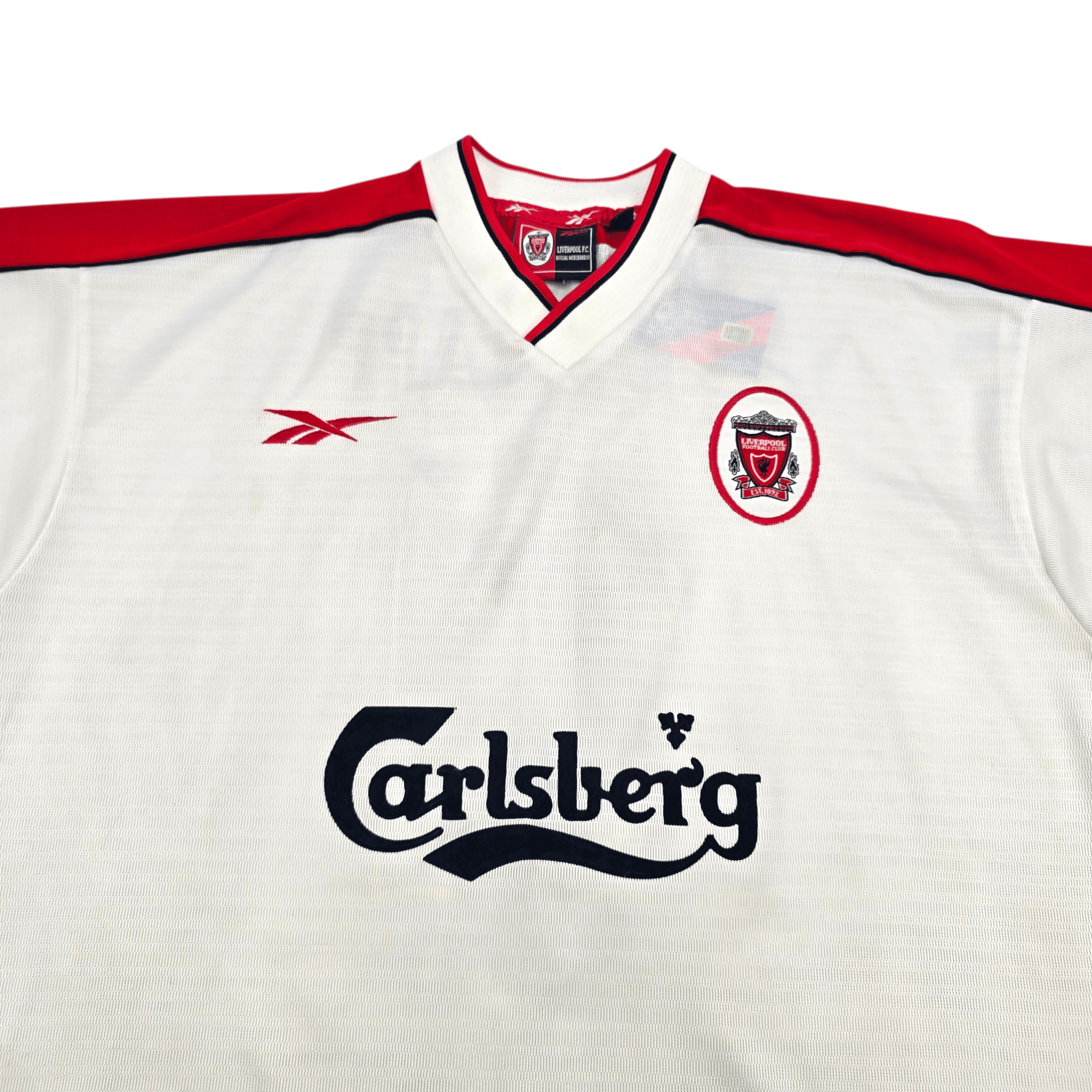 Information: Official Reebok Liverpool away football shirt, as worn by the ‘Reds’ during the 1998/99 season, when the side, under Gérard Houllier and Roy Evans, finished seventh in the Premier League during a transitional campaign that began reshaping the squad for future success. The reverse of the shirt boasts the nameset of club legend, Jamie Redknapp. A fantastic vintage jersey, ideal for a collection of your own or the perfect gift for any football fan.