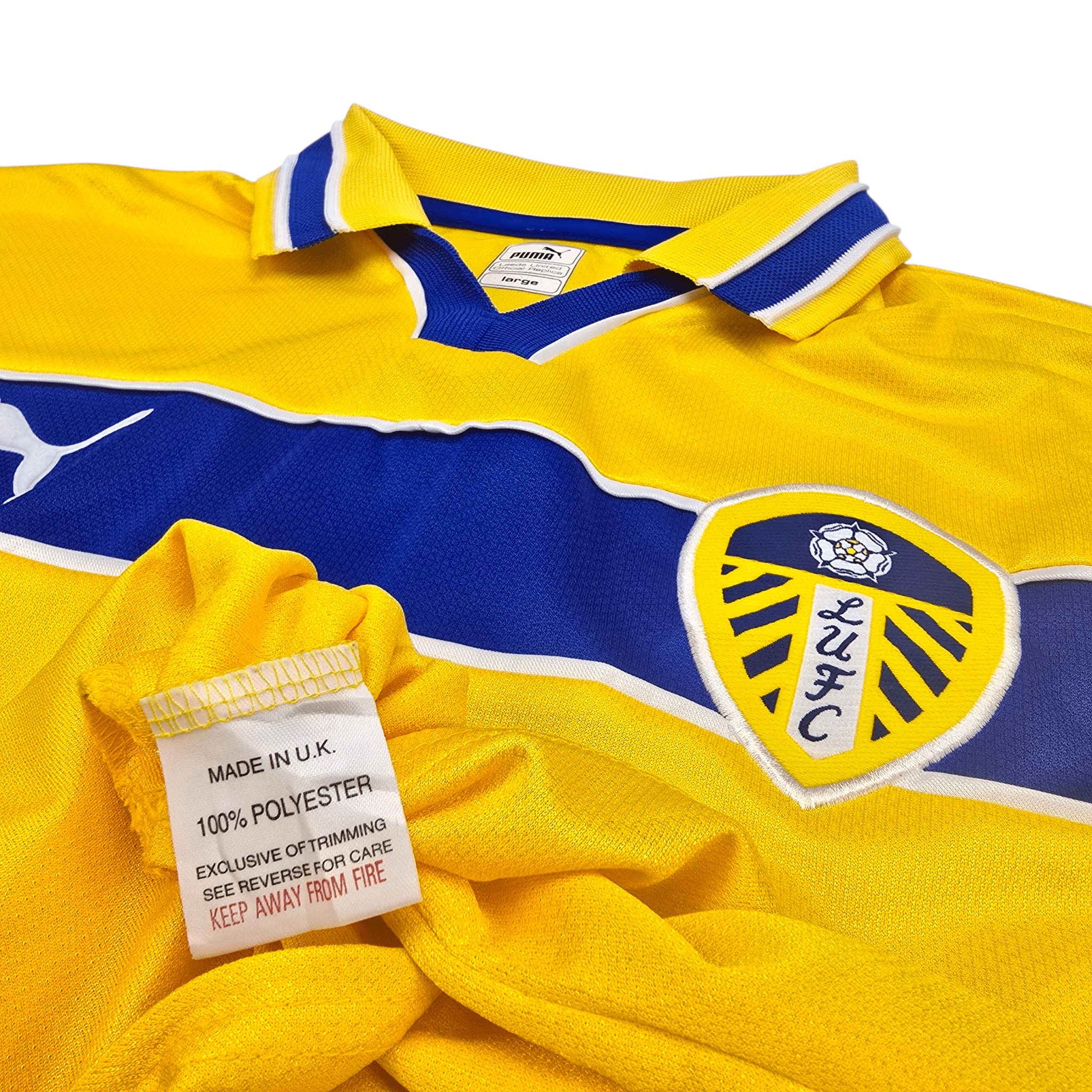 Information: Official Puma Leeds United third football shirt, as worn by ‘The Whites’ during the 1999/00 season, when the side, managed by David O’Leary, finished an impressive third in the Premier League and reached the semi-finals of the UEFA Cup with their fearless, high-energy young squad. The reverse of the shirt boasts the nameset of club legend, Alan Smith. A fantastic vintage jersey, ideal for a collection of your own or the perfect gift for any football fan.
