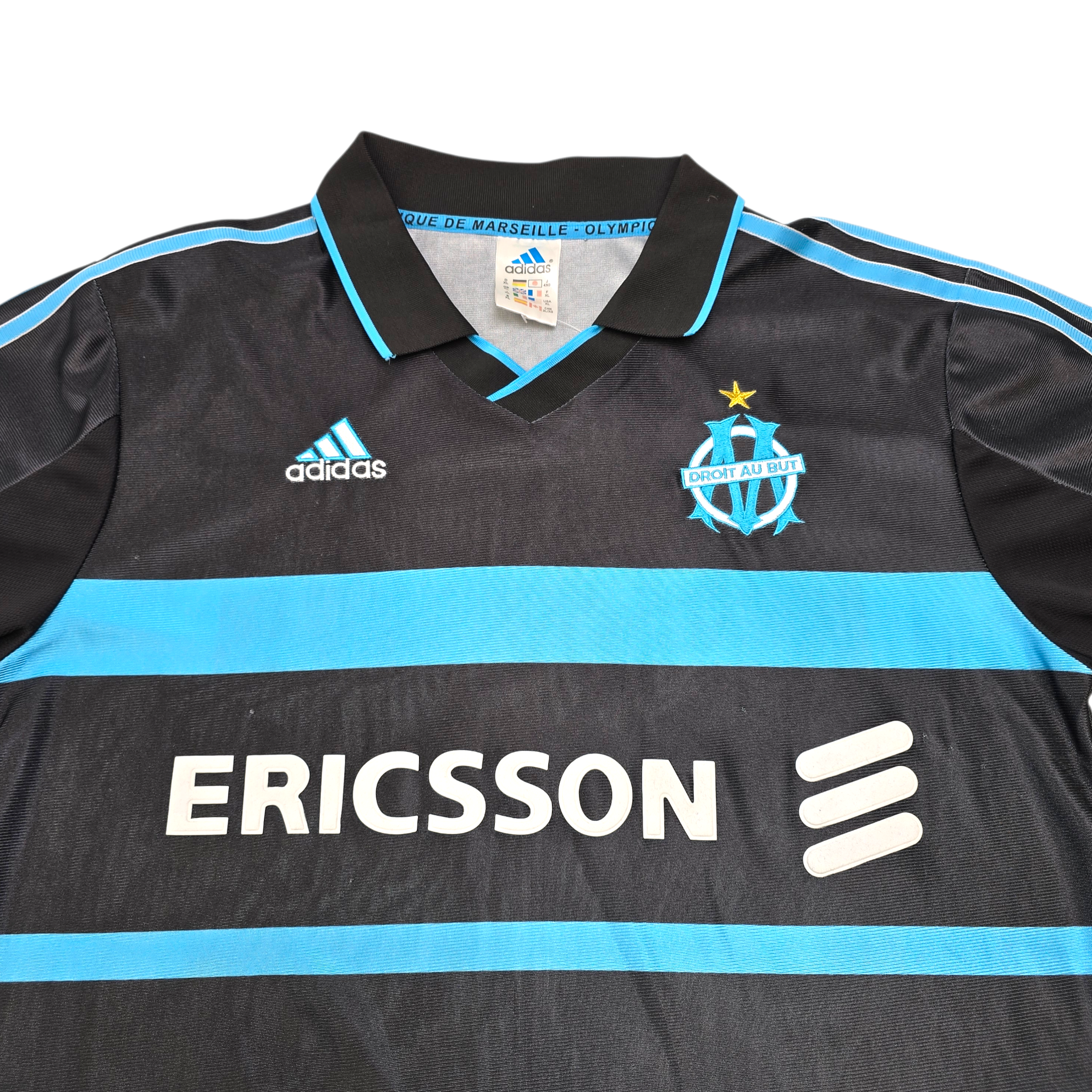 Information: Official Adidas Olympique Marseille third football shirt, as worn by ‘Les Phocéens’ during the 1999/00 season, when the side competed in Ligue 1 and aimed to secure European qualification while maintaining strong domestic performances. A fantastic vintage jersey, ideal for a collection of your own or the perfect gift for any football fan.