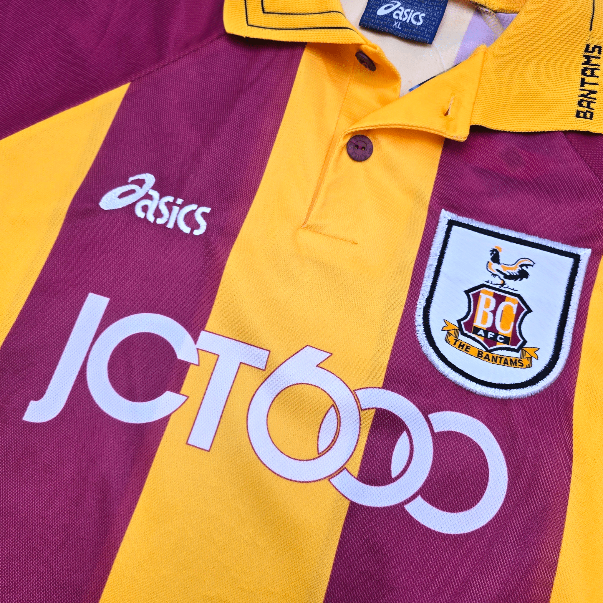 Information: Official Asics Bradford City home football shirt, as worn by 'The Bantams' between 1999-2001, when the side competed in the First Division and battled to maintain strong mid-table positions following their relegation from the Premier League. A fantastic vintage jersey, ideal for a collection of your own or the perfect gift for any football fan.