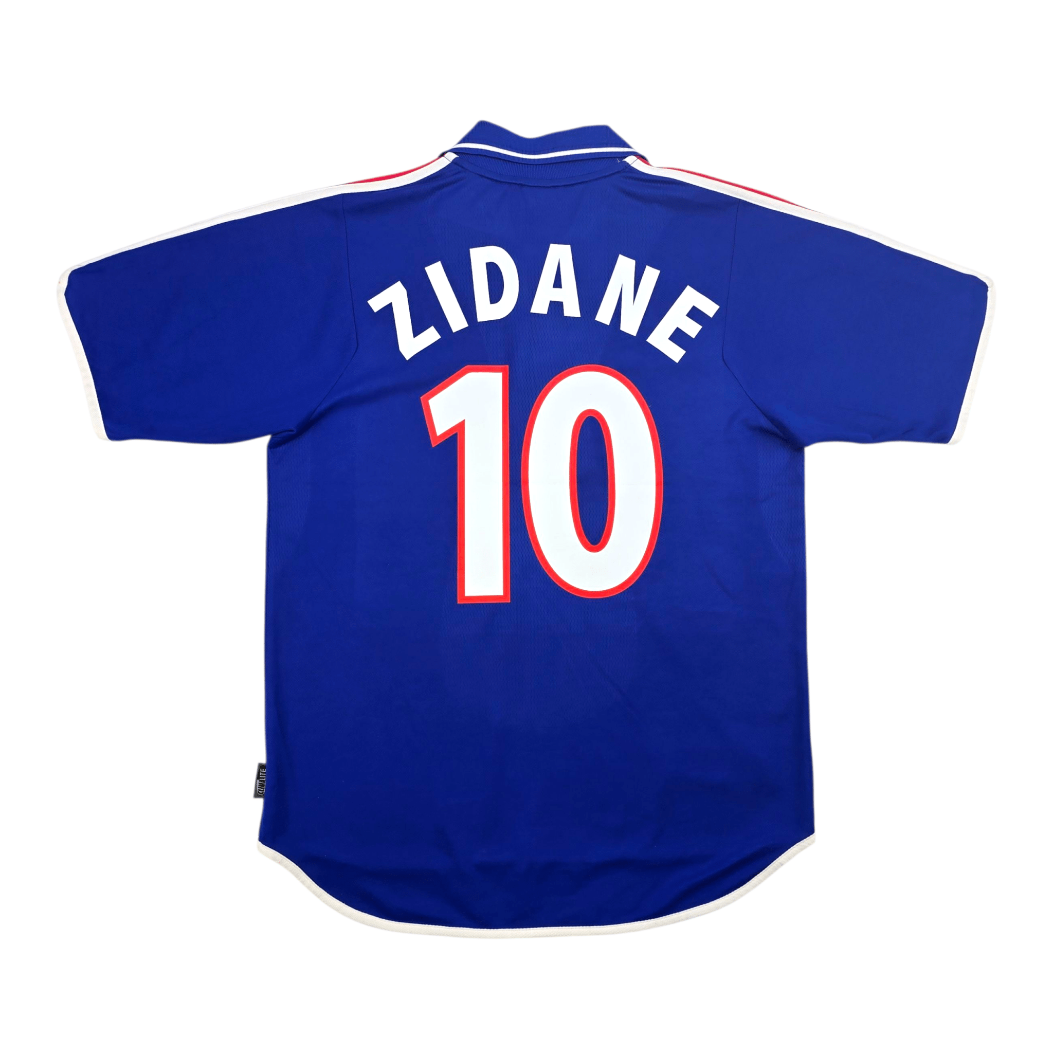 Information: Official Adidas France home football shirt, as worn by ‘Les Bleus’ between 2000-2002, when the side reigned as European and World champions, lifting the Euro 2000 trophy after a dramatic golden goal victory over Italy. The reverse of the shirt boasts the nameset of team legend, Zinedine Zidane. A fantastic vintage jersey, ideal for a collection of your own or the perfect gift for any football fan.