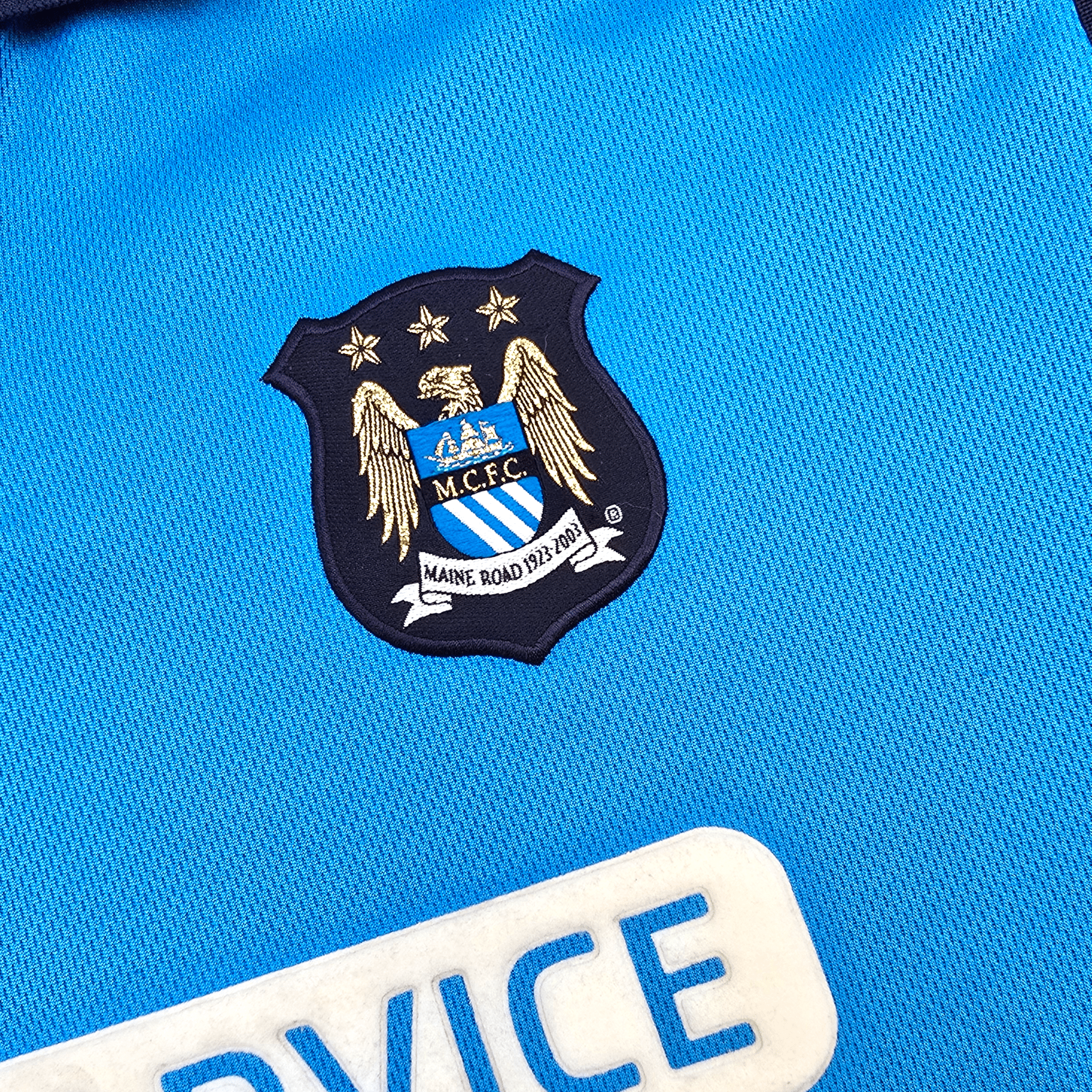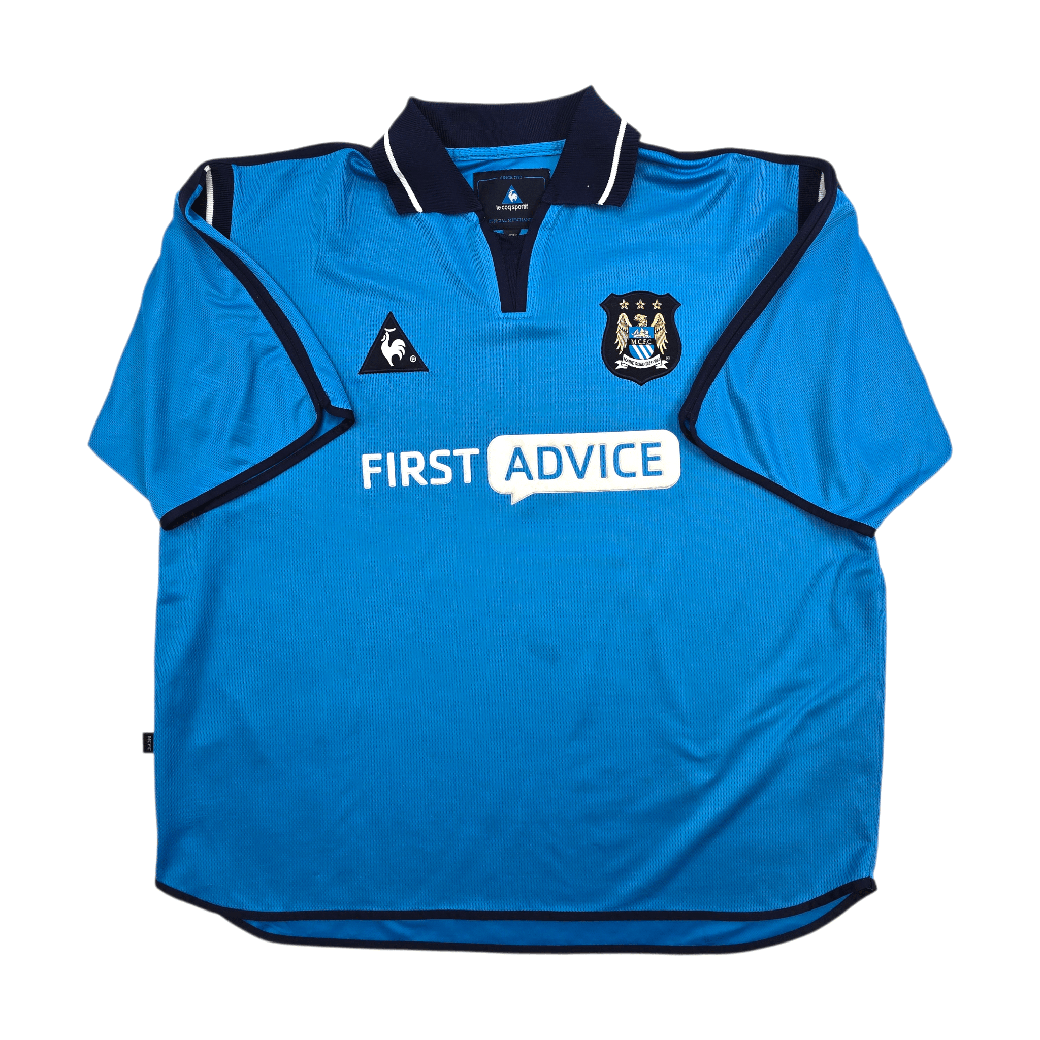 Information: Official Le Coq Sportif Manchester City home football shirt, as worn by 'The Citizens' during the 2001/02 season, when the club achieved promotion to the Premier League under manager Kevin Keegan. A fantastic vintage jersey, ideal for a collection of your own or the perfect gift for any football fan.