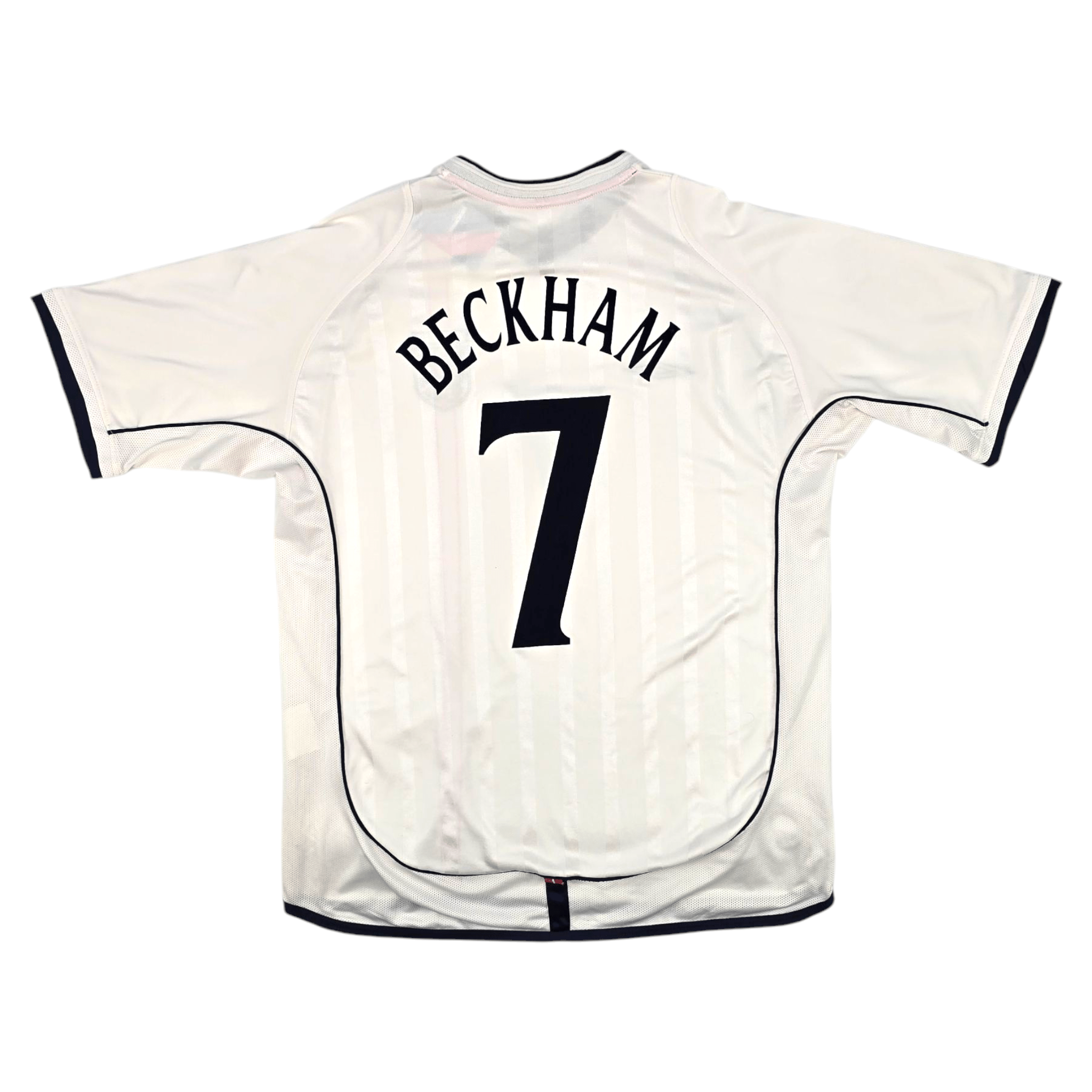 Information: Official Umbro England home football shirt from 2001/03, as worn by ‘The Three Lions’ when Beckham's 93rd minute free-kick against Greece famously secured England a place at the 2002 FIFA World Cup Finals in Korea & Japan. During the tournament, the Three Lions reached the quarter-finals of the competition. The reverse of the shirt boasts the nameset of England legend, David Beckham, who made 115 appearances for his country, many as captain. A fantastic vintage jersey, ideal for a collection of your own or the perfect gift for any football fan.
