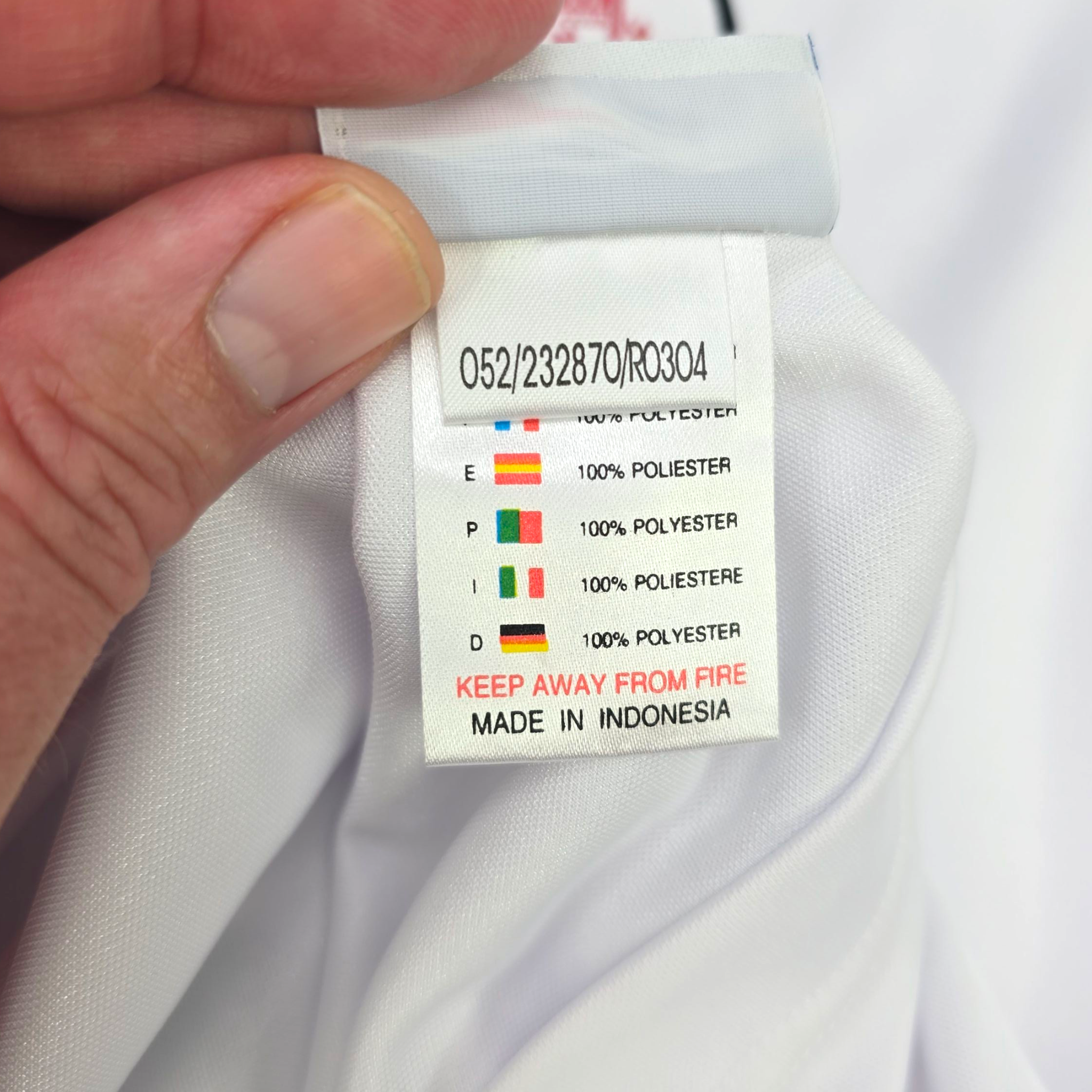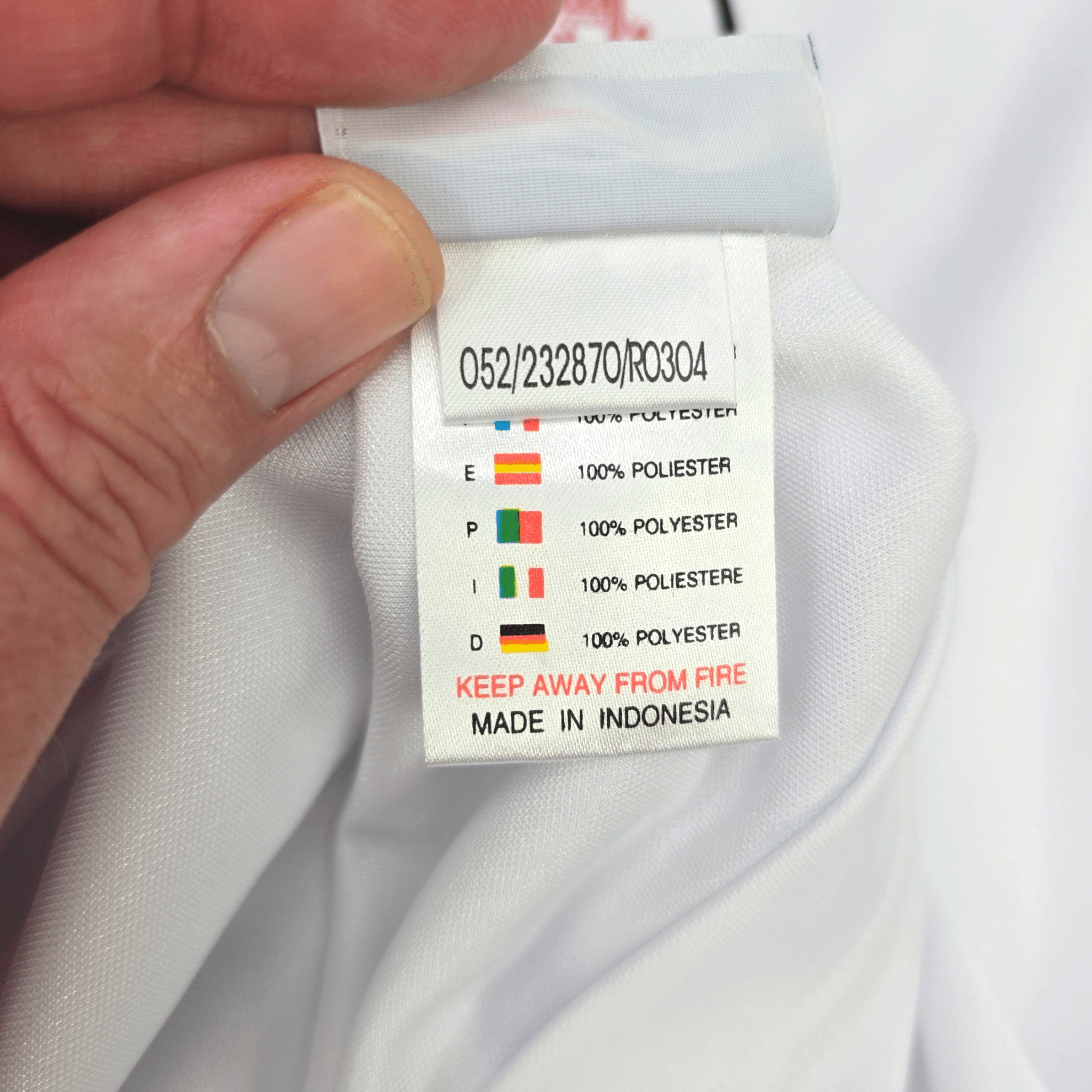 Condition: Excellent. Superb colours, material is smooth with a few tiny bobbles, no pulls, tears or holes. One small stain to midriff only visible upon close inspection (see photo). Embossed manufacturer logo & stitched club badge are excellent, as is flock chest sponsor. Flock player nameset to reverse is as new. Collar, sleeves and hem are in fabulous condition.