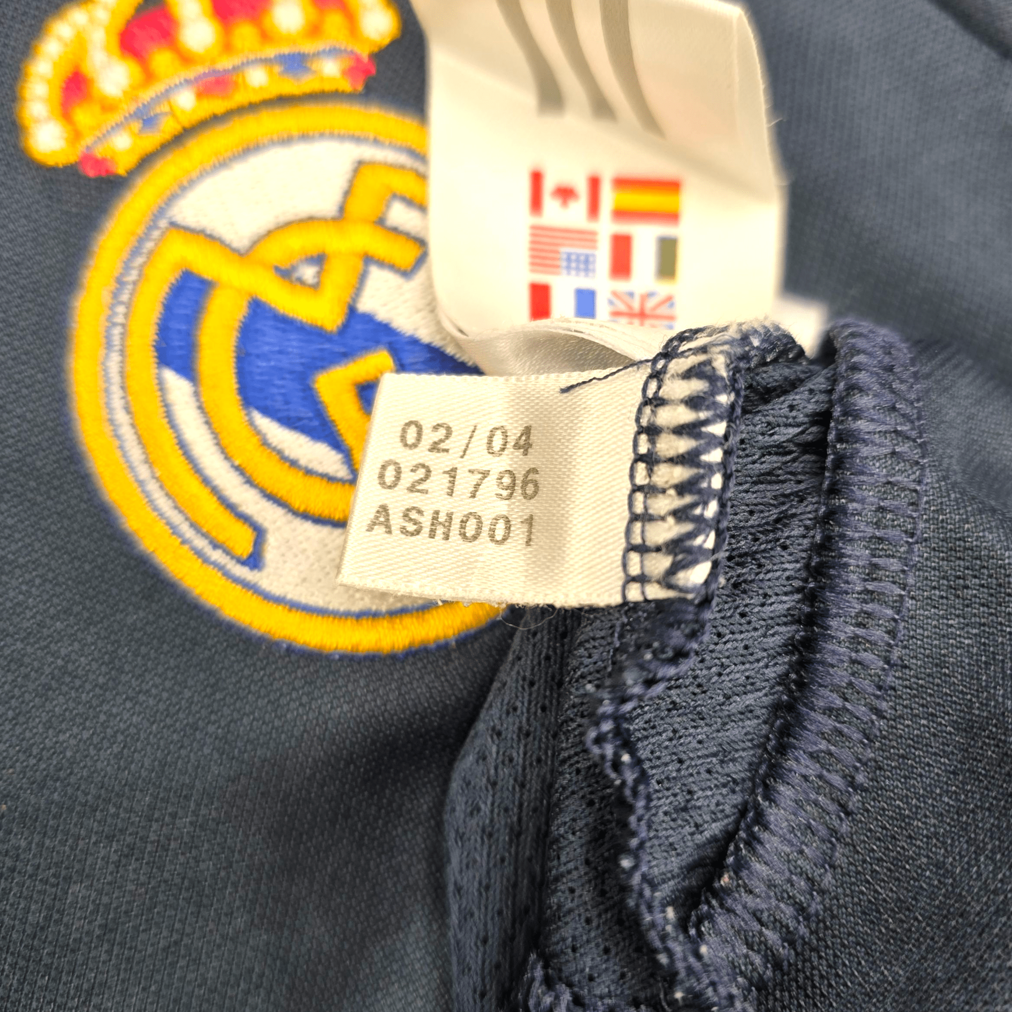 Information: Official Adidas Real Madrid away football shirt, as worn by 'Los Blancos' during the 2003/04 season. The reverse of the shirt boasts the nameset of club legend, Ronaldo Nazário. Asian market issue, so contains internal wash labels for the region. A fantastic vintage jersey, ideal for a collection of your own or the perfect gift for any football fan.
