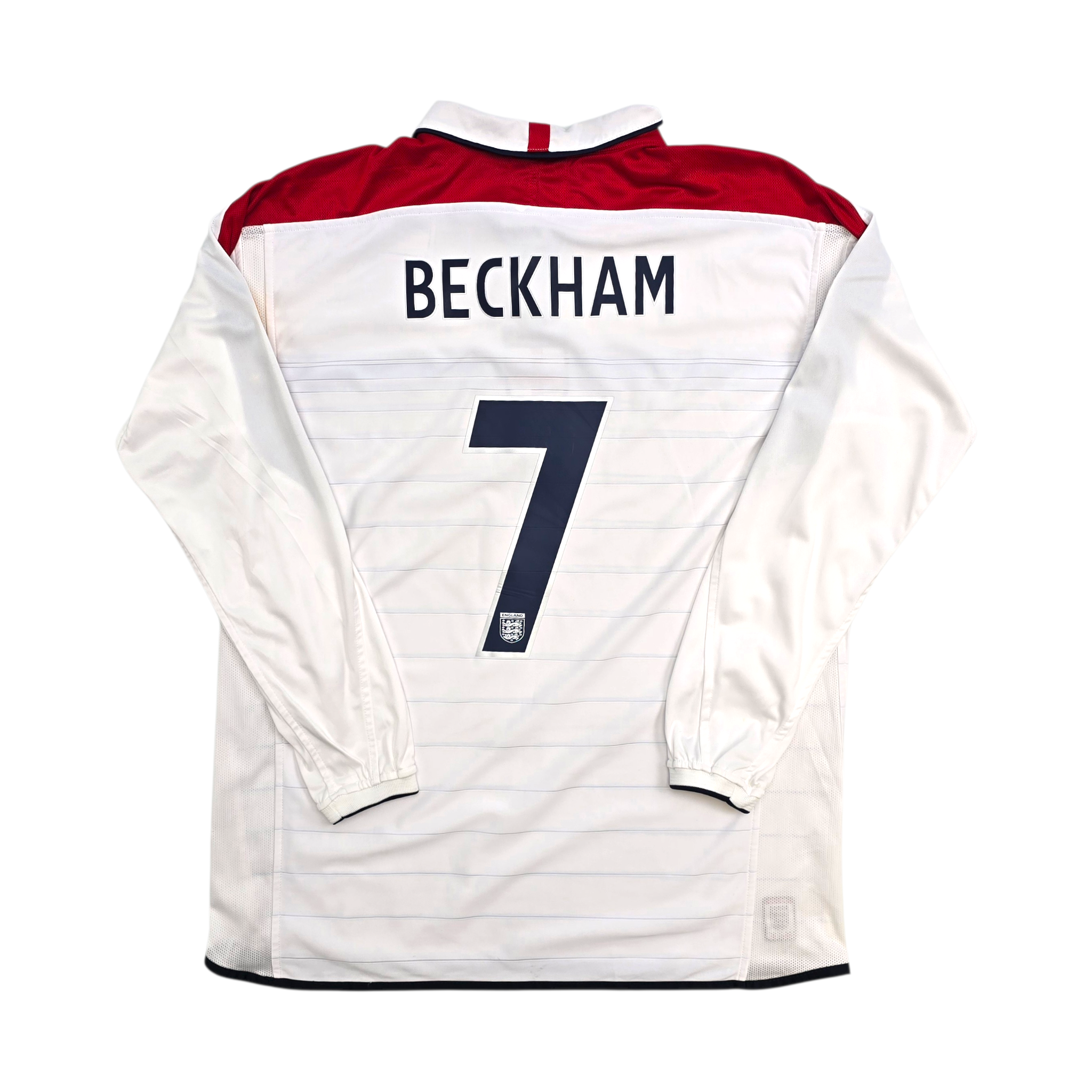 Information: Official Umbro England home football shirt, as worn by the ‘Three Lions’ during the 2003/05 season, when the national side qualified for Euro 2004 and reached the quarter-finals of the tournament in Portugal after an impressive qualifying campaign. The reverse of the shirt boasts the nameset of team legend, David Beckham. A fantastic, reversible vintage long sleeve jersey, ideal for a collection of your own or the perfect gift for any football fan.