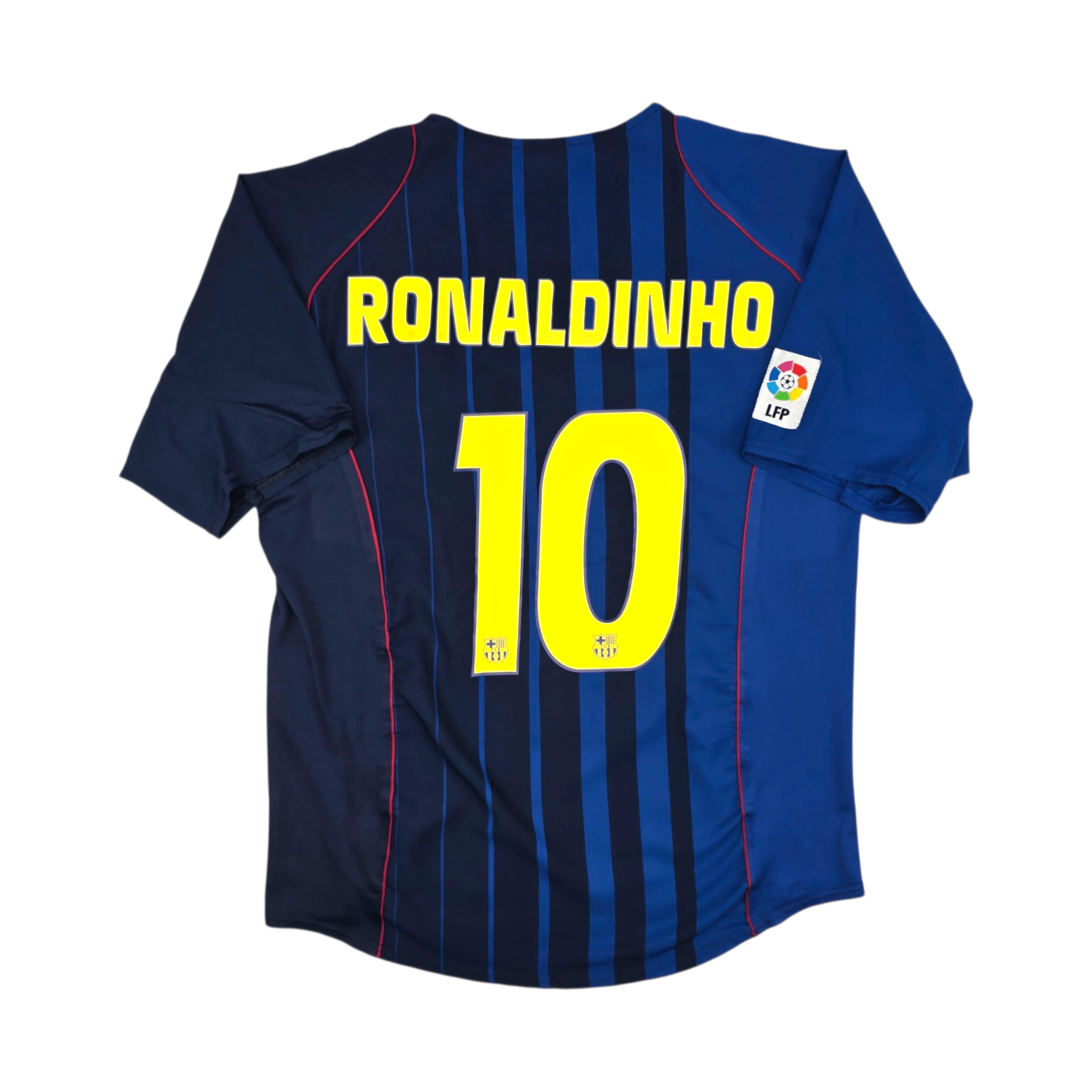 Information: Official Nike Barcelona away football shirt, as worn by 'Barça' during the 2004/05 season, when the side won the La Liga title under Frank Rijkaard, marking the beginning of a new era of dominance. The reverse of the shirt boasts the nameset of club legend, Ronaldinho. A fantastic vintage jersey, ideal for a collection of your own or the perfect gift for any football fan.