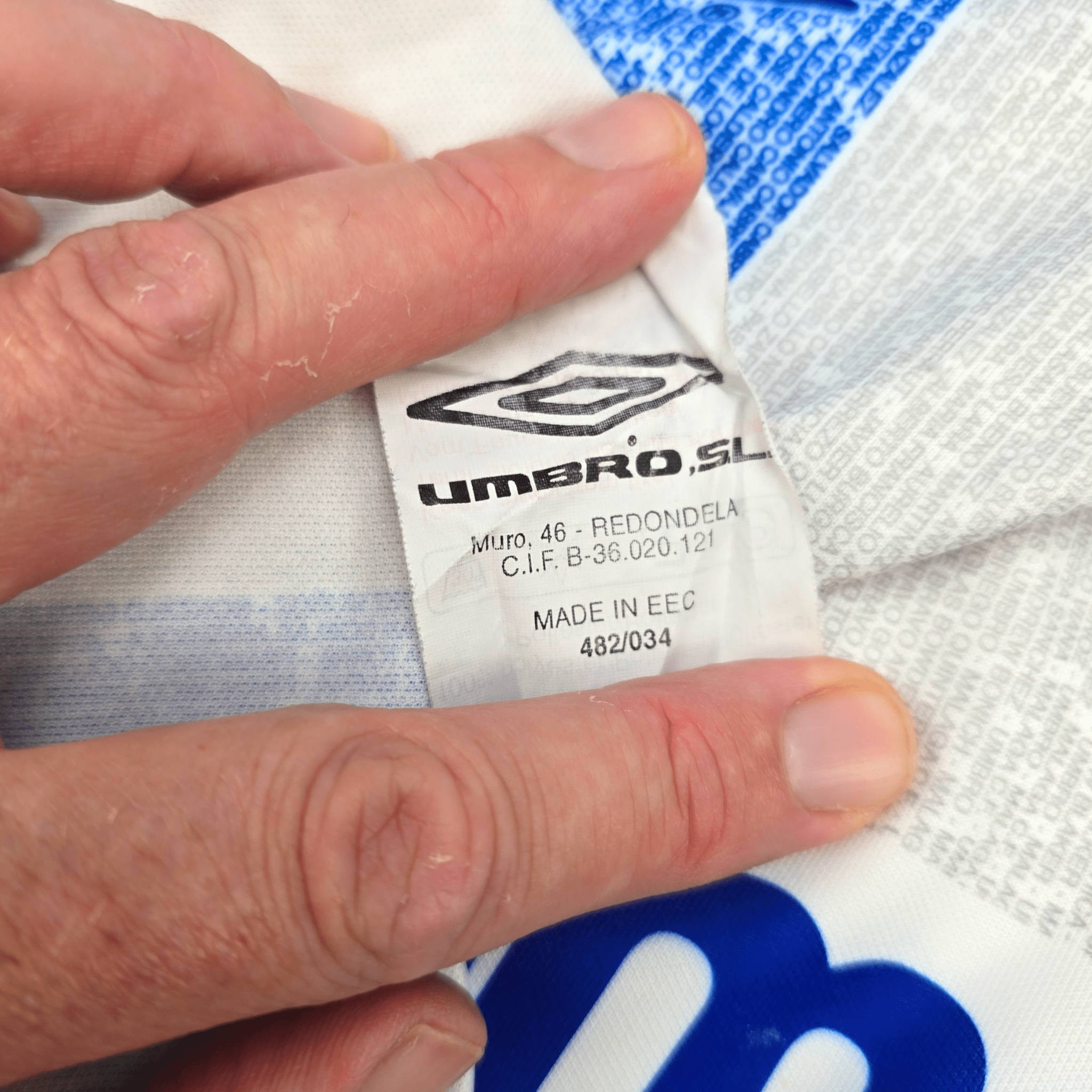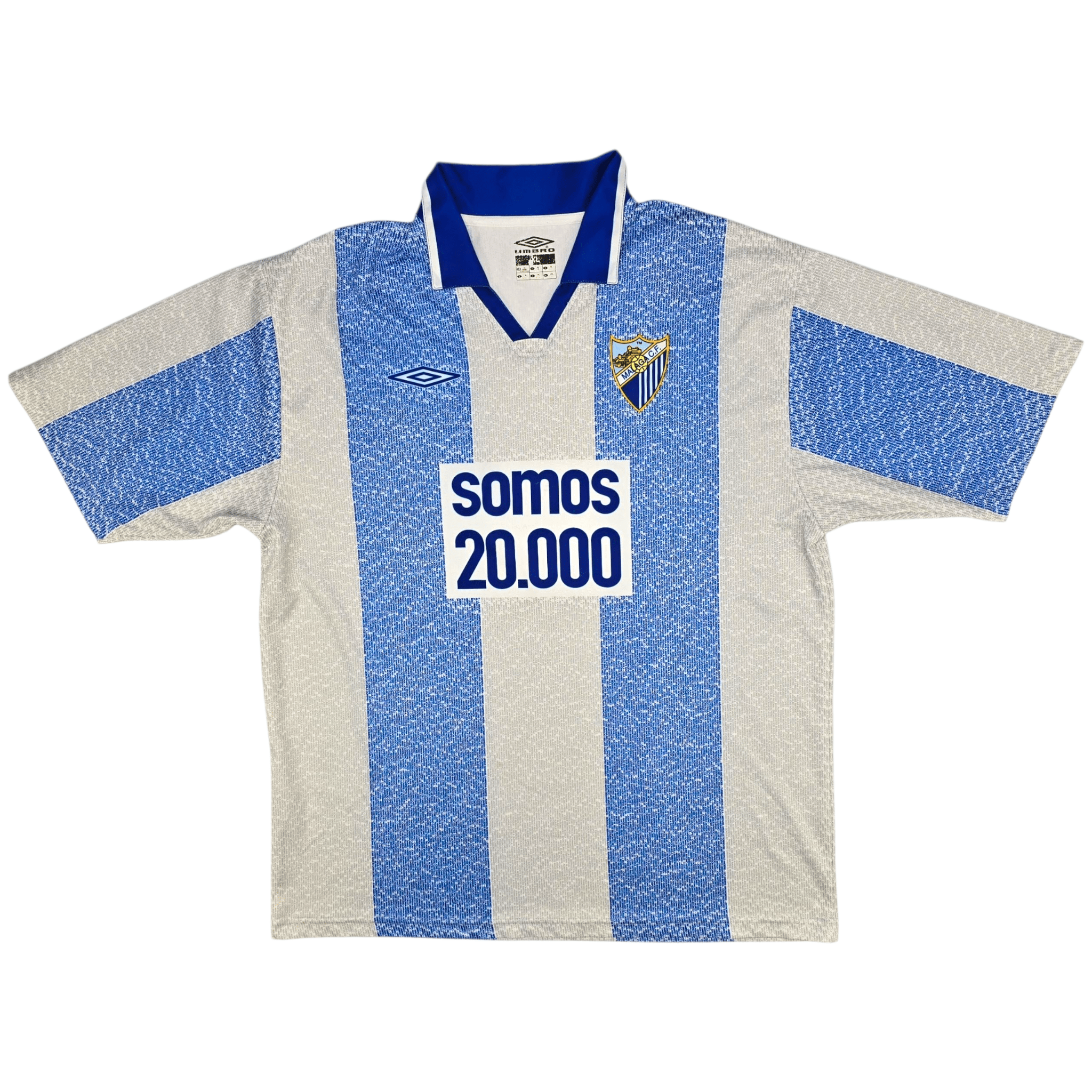 Information: Official Umbro Málaga home football shirt, as worn by 'Los Boquerones' during the 2004/05 season. The shirt features the unique 'Somos 20.000' (We are 20,000) slogan, symbolizing the passionate fanbase. A fantastic vintage jersey, ideal for a collection of your own or the perfect gift for any football fan.