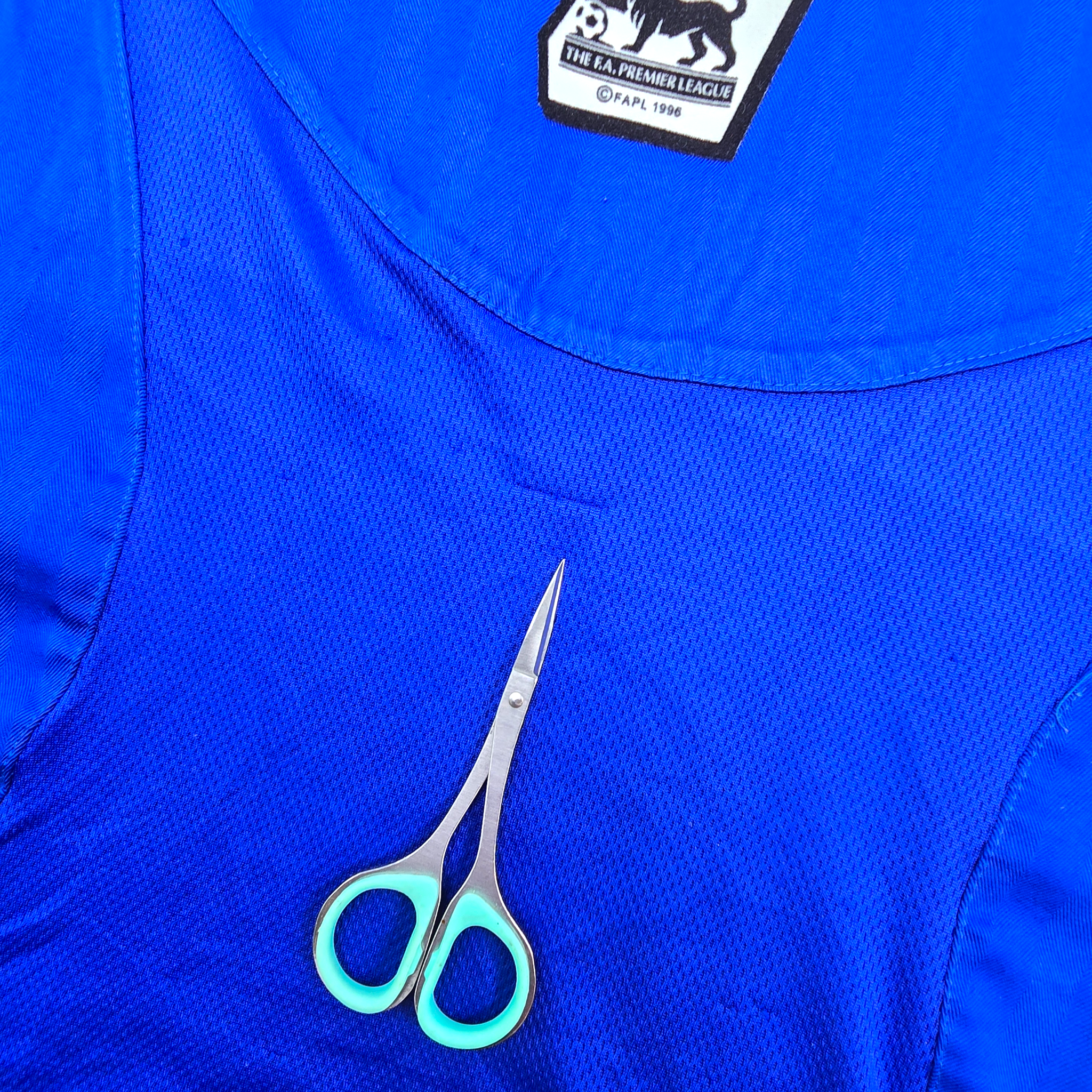Condition: Excellent. Superb colours, material is smooth with a few tiny bobbles with no tears or holes. There is just a small 2cm pull to the reverse mesh above the tail (see photo). Embroidered manufacturer logo & club badge are excellent. Vinyl chest sponsor shows very light wear but is still 100% complete (see photo). Collar, sleeves & hem are in fabulous condition.