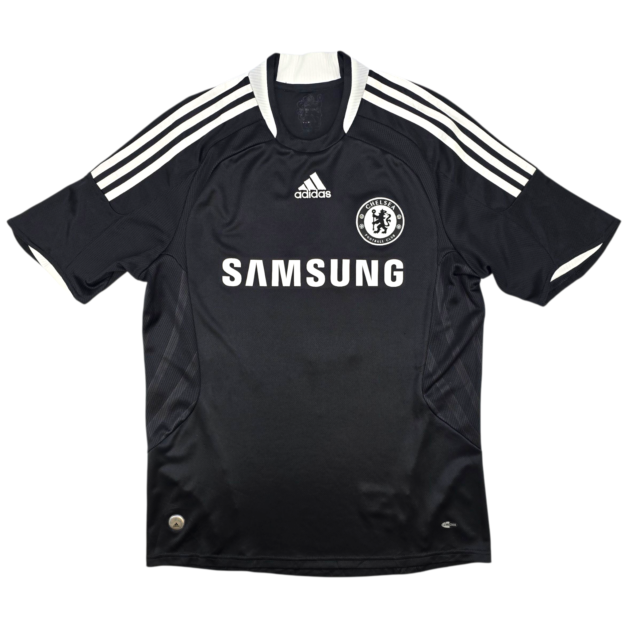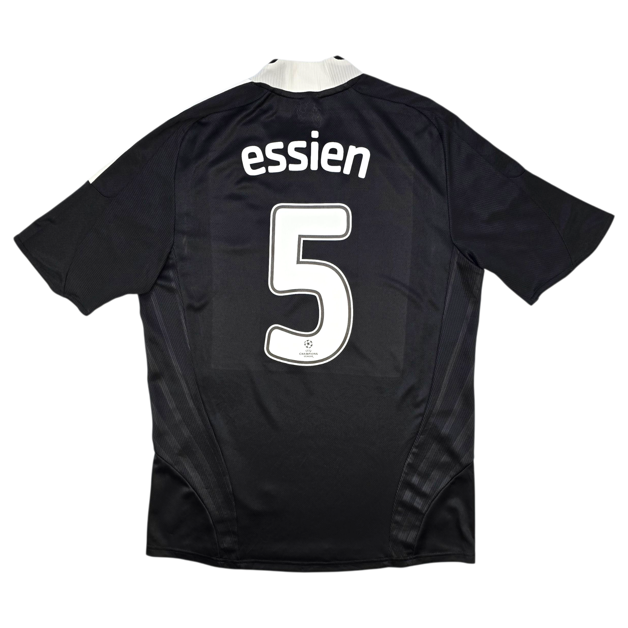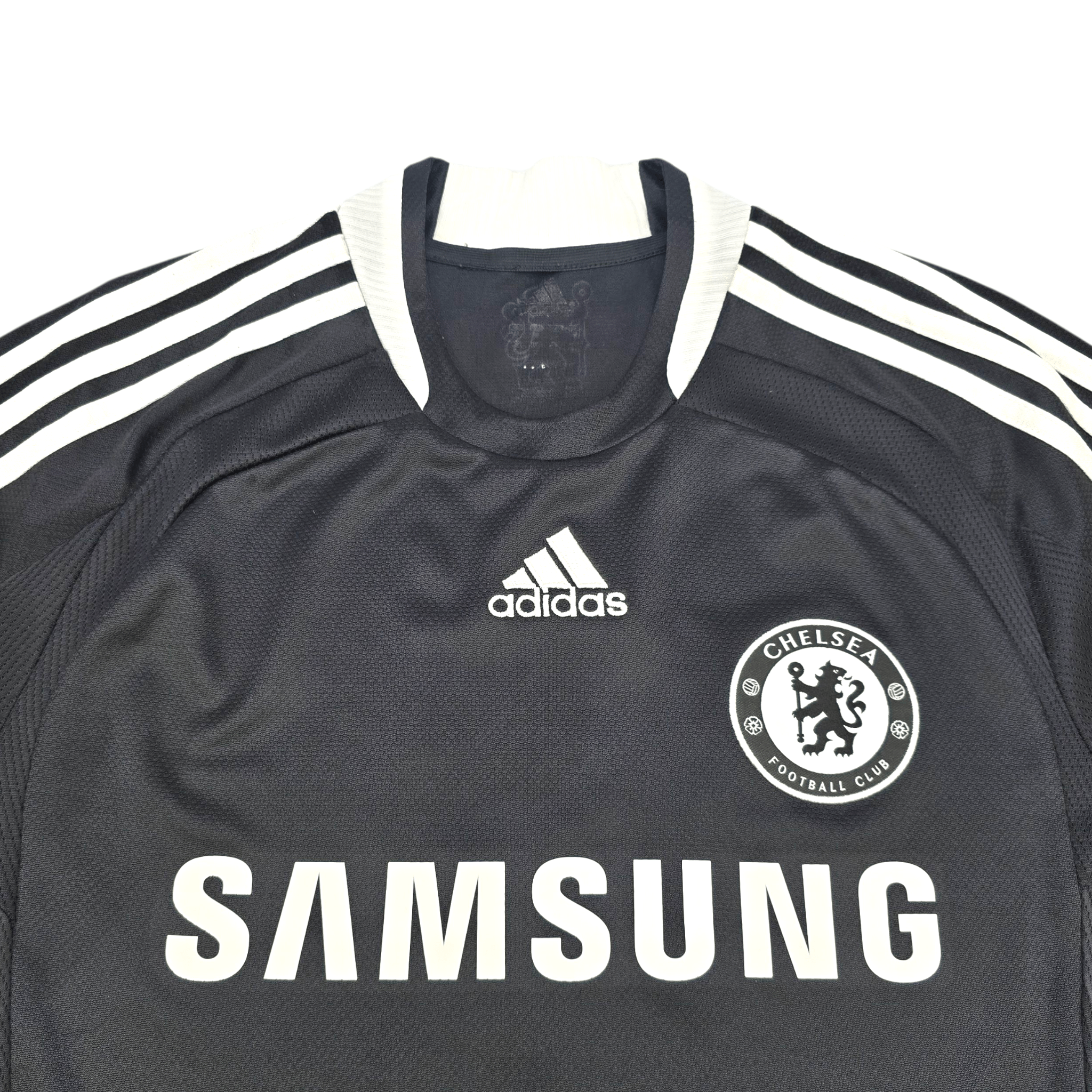 Information: Official Adidas Chelsea away football shirt, as worn by 'The Blues' during the 2008/09 season, when they reached the UEFA Champions League semi-finals. The reverse of the shirt boasts the nameset of club legend, Michael Essien. A fantastic vintage jersey, ideal for a collection of your own or the perfect gift for any football fan.