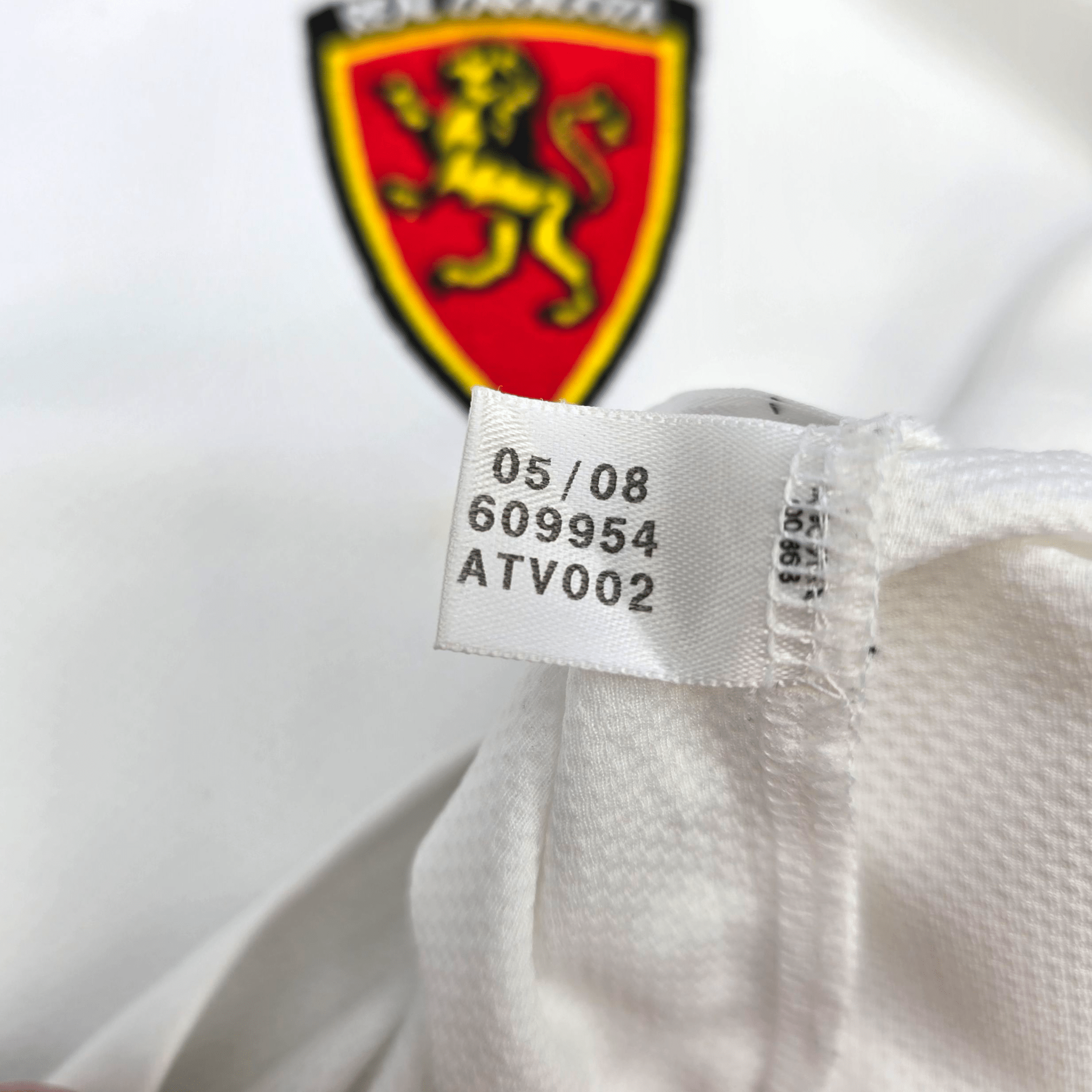 Condition: Very Good. Good colours, material is smooth with a few bobbles, small pulls & marks, some small stains, one larger stain to right sleeve (see photo), no tears or holes. Vinyl manufacturer logo & embroidered club badge are excellent. Vinyl sponsor patch to left sleeve shows minor damage (see photo). Wear to printed 'Formotion' transfer on hem. Stitched club badge to reverse is superb. Collar, sleeves and hem are in fabulous condition.