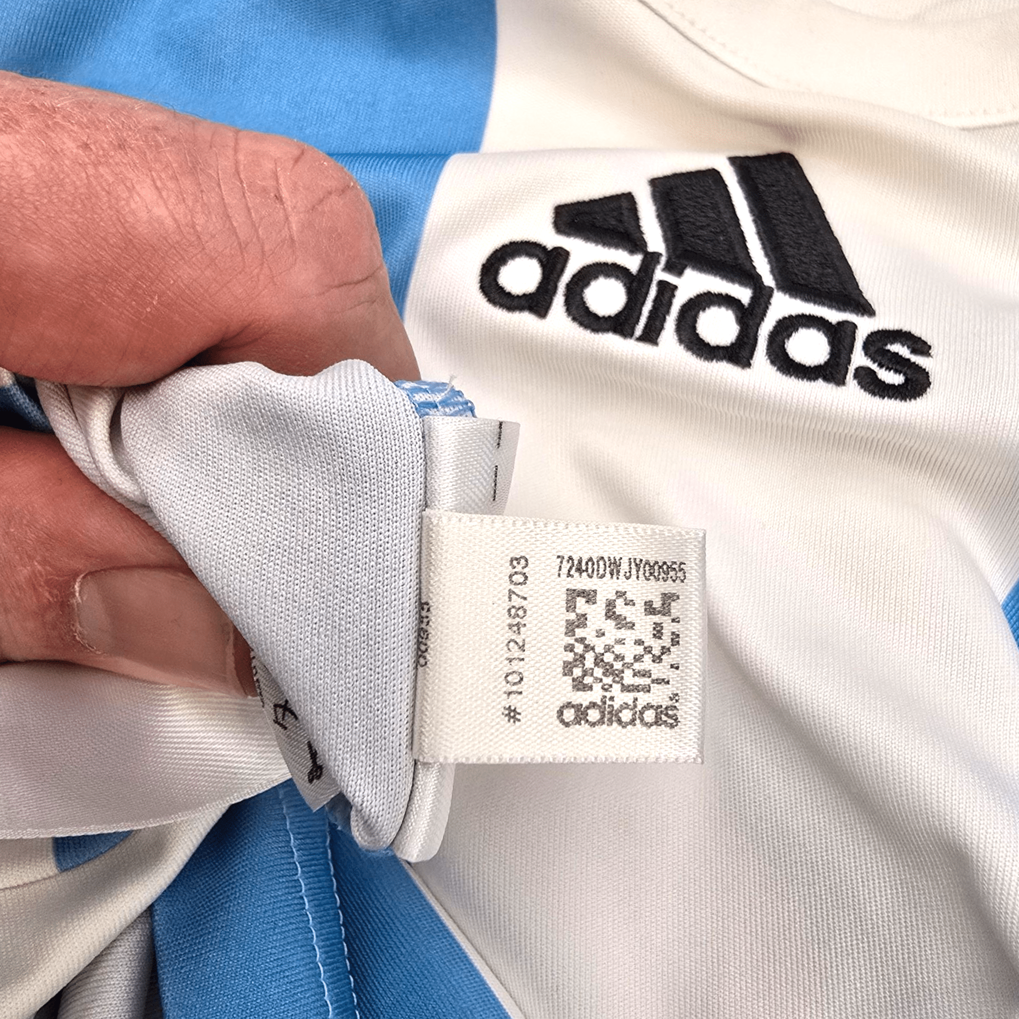 Information: Official Adidas Argentina home football shirt from 2010/11, as worn by ‘La Albiceleste’ when they competed in the FIFA World Cup of 2010 in South Africa, where they reached the quarter-final stage. The reverse of the shirt boasts the nameset of eight-time Ballon d'Or winner and Argentina's all-time top goalscorer, Lionel Messi. Asian market issue, so has internal was labels for the region. A fantastic jersey, ideal for a collection of your own or the perfect gift for any football fan.