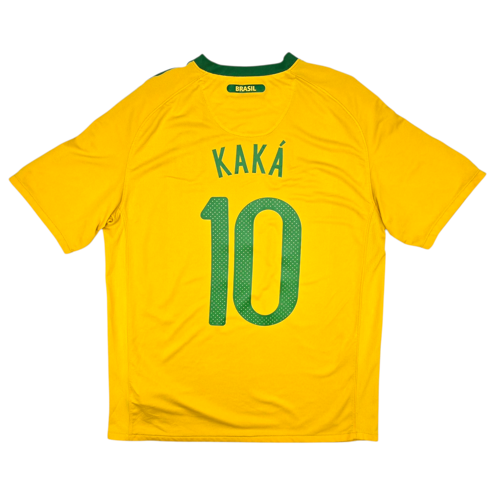 Information: Official Nike Brazil home football shirt, as worn by 'Seleção' during the 2010/11 season. The shirt featured at the 2010 FIFA World Cup in South Africa, where Brazil reached the quarter-finals before being eliminated by the Netherlands. The reverse of the shirt boasts the nameset of legend, Kaká. A fantastic vintage jersey, ideal for a collection of your own or the perfect gift for any football fan.
