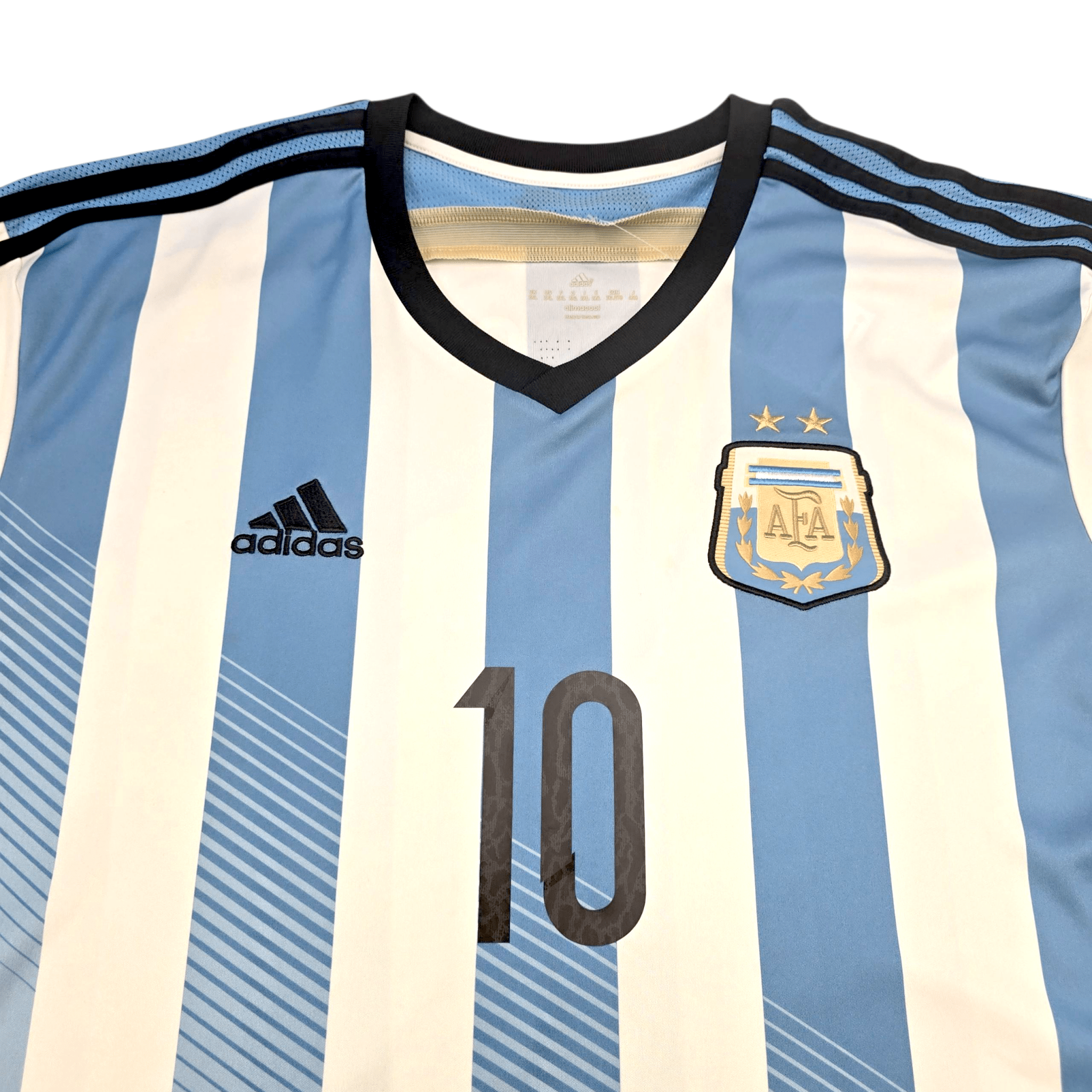 Information: Official Adidas Argentina home football shirt, as worn by ‘La Albiceleste’ during the 2014/15 season, when the side reached the 2014 World Cup Final in Brazil, narrowly losing to Germany after an inspired campaign under Alejandro Sabella. The reverse of the shirt boasts the nameset of team legend, Lionel Messi. A fantastic jersey, ideal for a collection of your own or the perfect gift for any football fan.