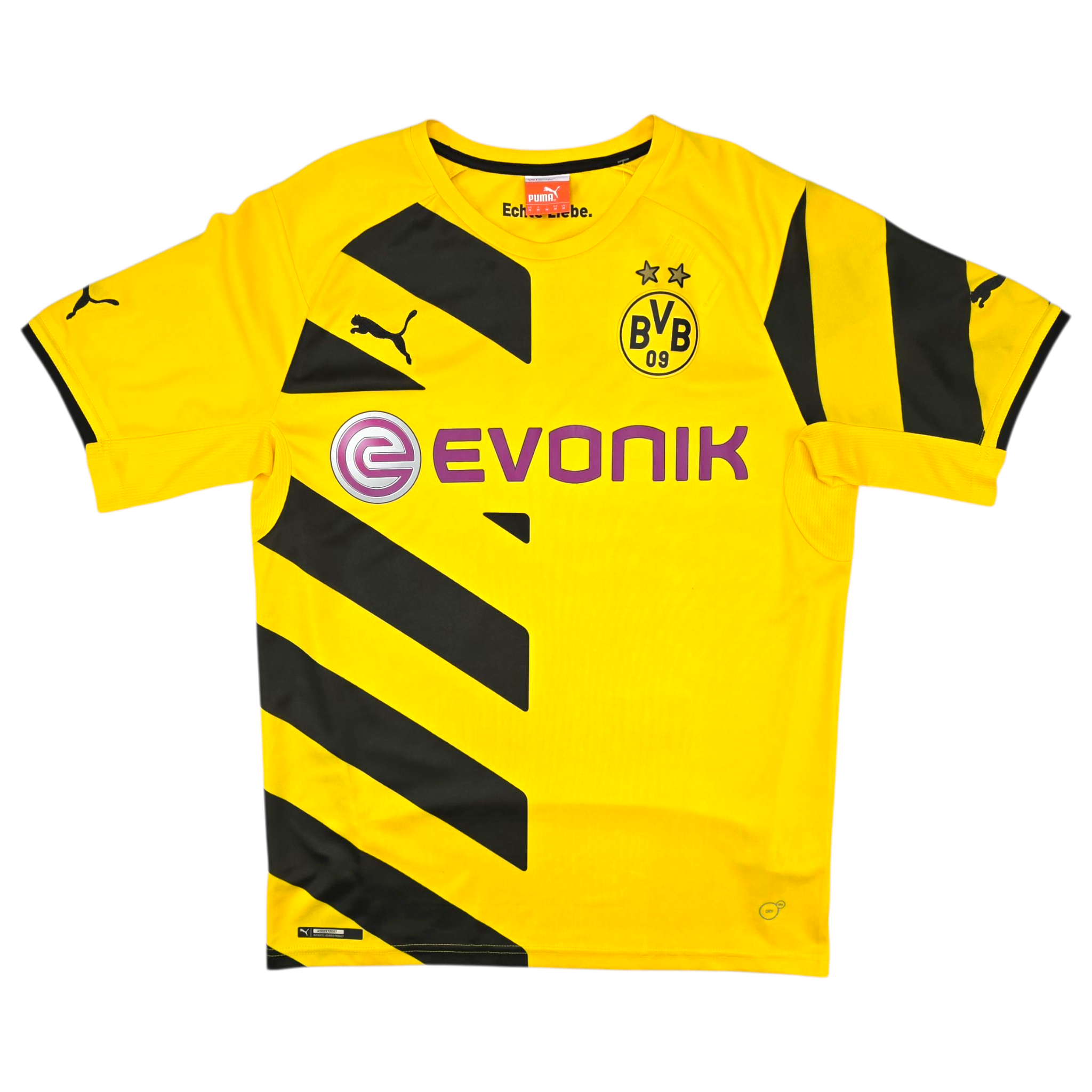 Information: Official Puma Borussia Dortmund home football shirt, as worn by 'Die Schwarzgelben' during the 2014/15 season, when the side secured European qualification and reached the DFB-Pokal final in Jürgen Klopp’s final year in charge. The reverse of the shirt boasts the nameset of club legend, Marco Reus. A fantastic jersey, ideal for a collection of your own or the perfect gift for any football fan.
