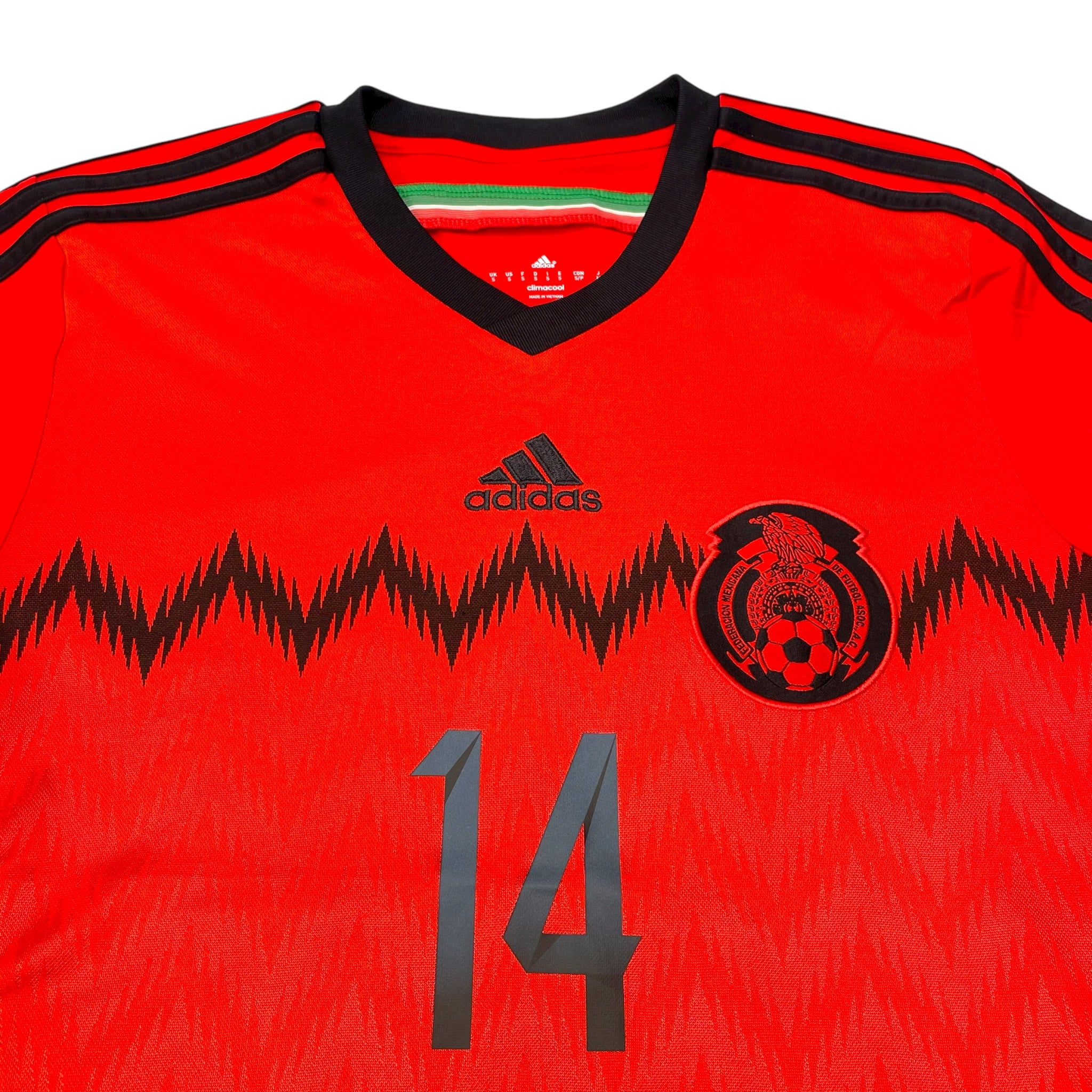 Information: Official Adidas Mexico away football shirt, as worn by 'El Tri' during the 2014/15 season. The reverse of the shirt boasts the nameset of legend, Javier Hernández (Chicharito). A fantastic vintage jersey, ideal for a collection of your own or the perfect gift for any football fan.
