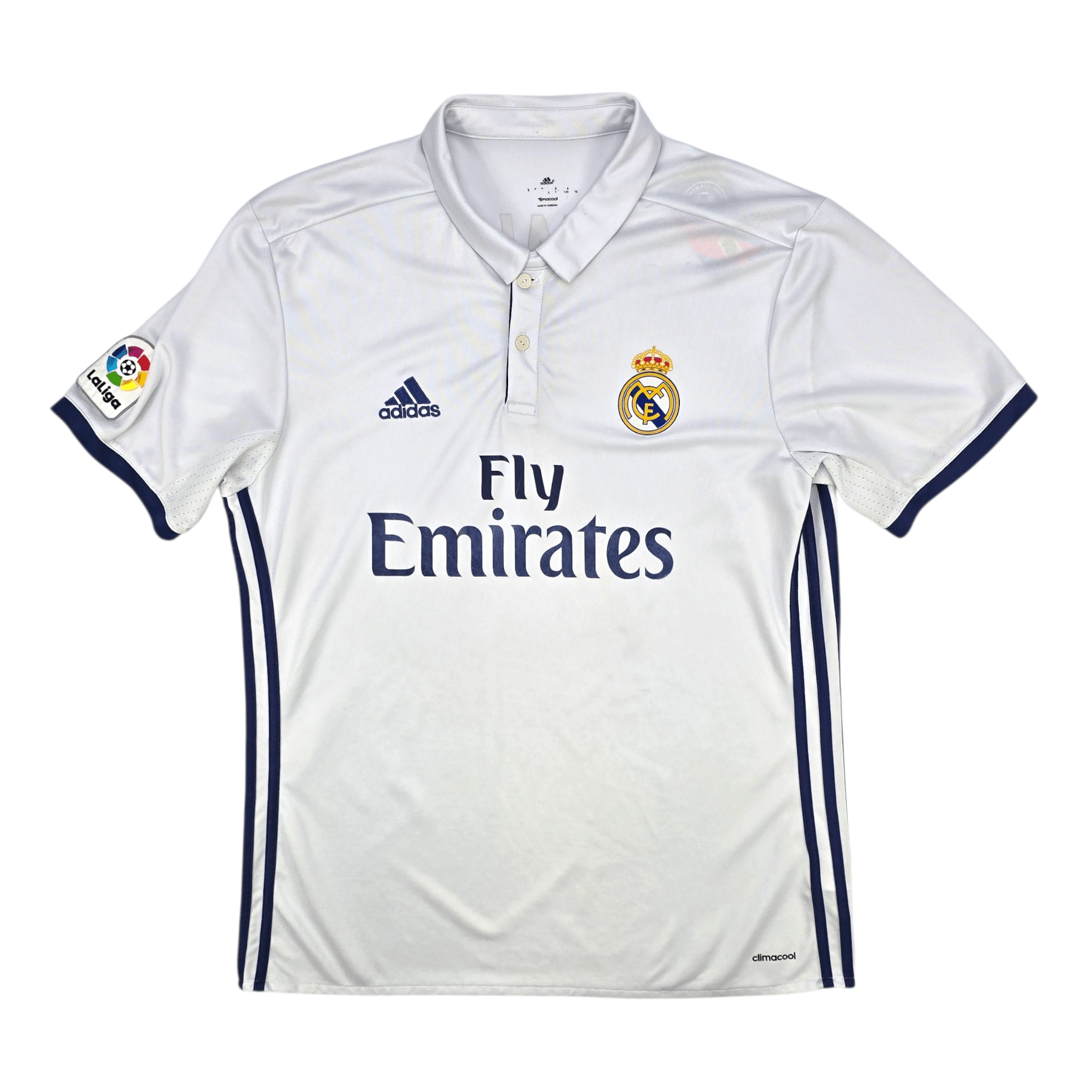 Information: Official Adidas Real Madrid home football shirt, as worn by 'Los Blancos' during the 2014/15 season, when the side won the UEFA Super Cup and FIFA Club World Cup under Carlo Ancelotti. The reverse of the shirt boasts the nameset of club legend, Cristiano Ronaldo. A fantastic jersey, ideal for a collection of your own or the perfect gift for any football fan.