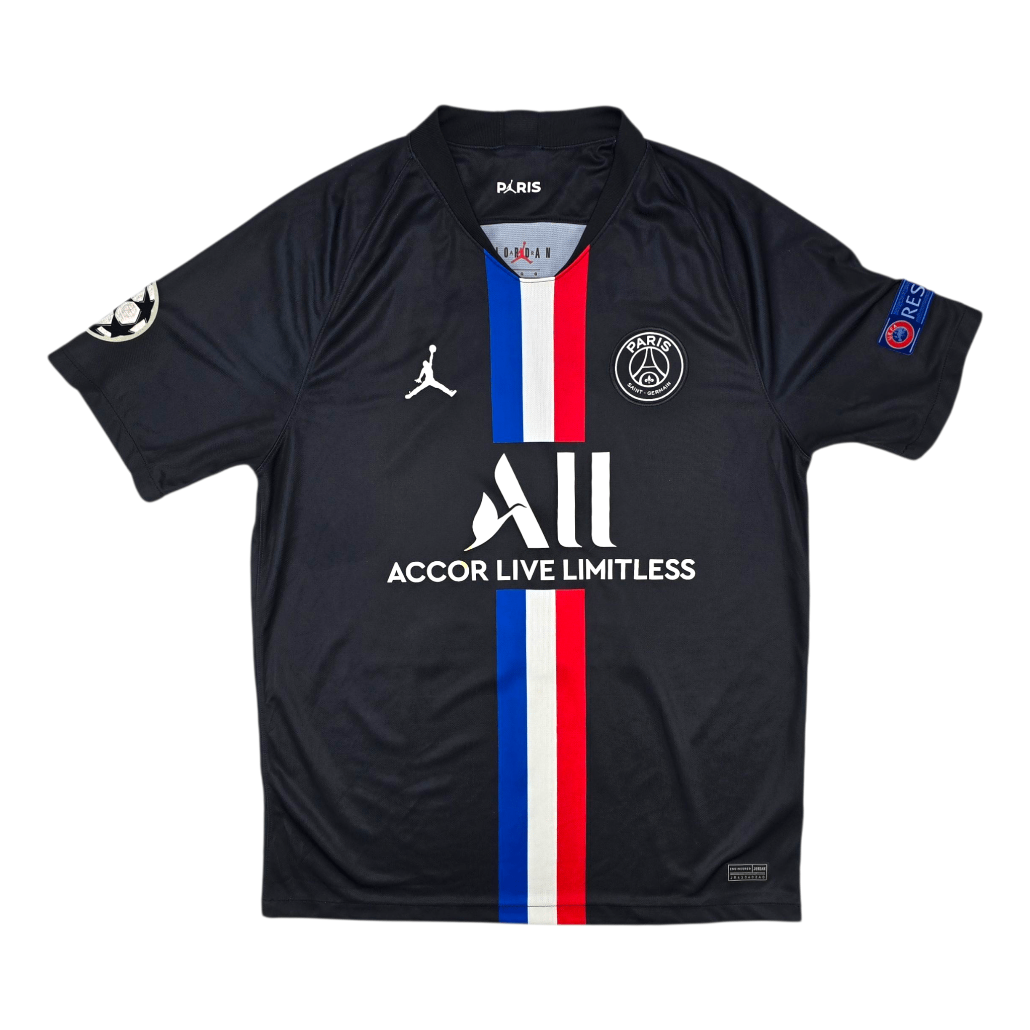 Information: Official Nike Paris Saint-Germain fourth football shirt, as worn by 'Les Parisiens' during the 2019/20 season, when the side dominated domestically by winning the Ligue 1 title, Coupe de France, and Coupe de la Ligue, and reached their first-ever Champions League Final. The reverse of the shirt boasts the nameset of club legend, Kylian Mbappé. A fantastic jersey, ideal for a collection of your own or the perfect gift for any football fan.