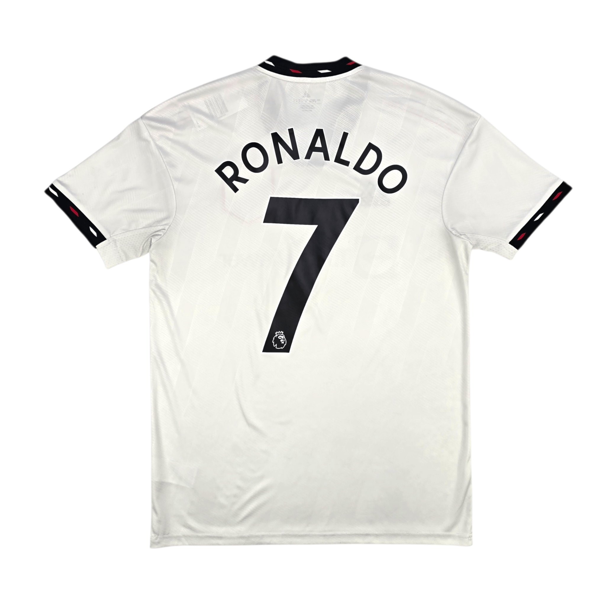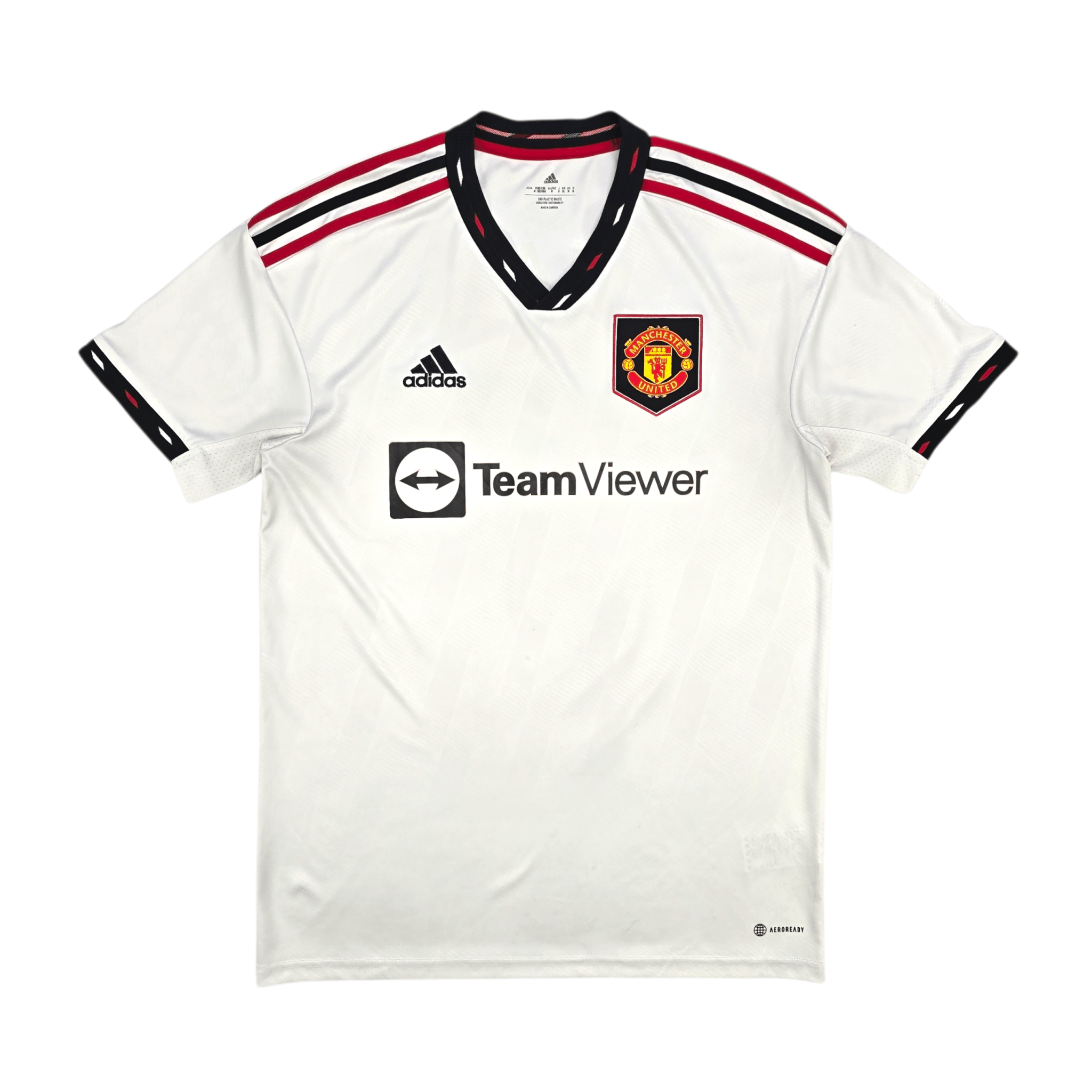Information: Official Adidas Manchester United away football shirt, as worn by the ‘Red Devils’ during the 2022/23 season, when the side, under Erik ten Hag, secured a top-four Premier League finish and lifted the Carabao Cup to claim their first silverware in six years. The reverse of the shirt boasts the nameset of club legend, Cristiano Ronaldo. A fantastic jersey, ideal for a collection of your own or the perfect gift for any football fan.